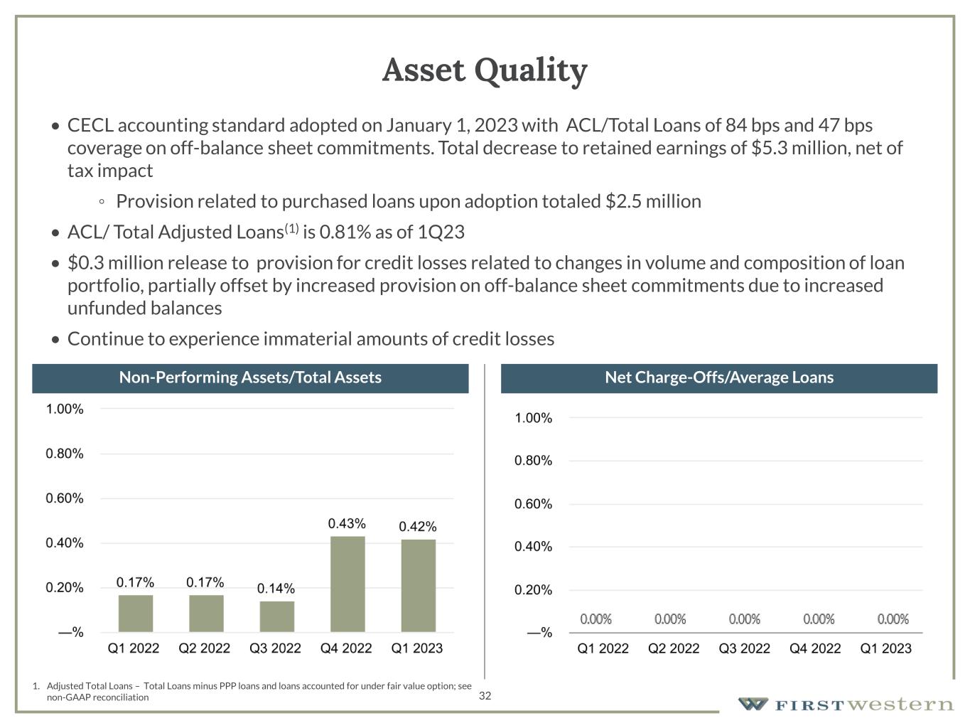 31 Non-Interest Expense and Efficiency Ratio • Non-interest expense increased 3.1% from 4Q22 • Increase primarily due to an increase in Salary and employee benefits, driven by the seasonality of payroll taxes in addition to lower deferred compensation due to fewer loan originations, partially offset by a decrease in technology and marketing expense • Headcount reduced by 22 FTE from 4Q22 to 1Q23 • Increase in FDIC insurance due to the FDIC's two basis point uniform increase in assessment rates and the Company's increase in total assets • Organizational-wide review of expense levels resulted in additional cost savings that are expected to keep non-interest expenses in the range of $19 million to $20 million for the remainder of 2023 (1) 1. See Non-GAAP reconciliation Total Non-Interest Expense Operating Efficiency Ratio(1) (in thousands) (1) (1) (1) (1)(1) ((1) (1) (1)
