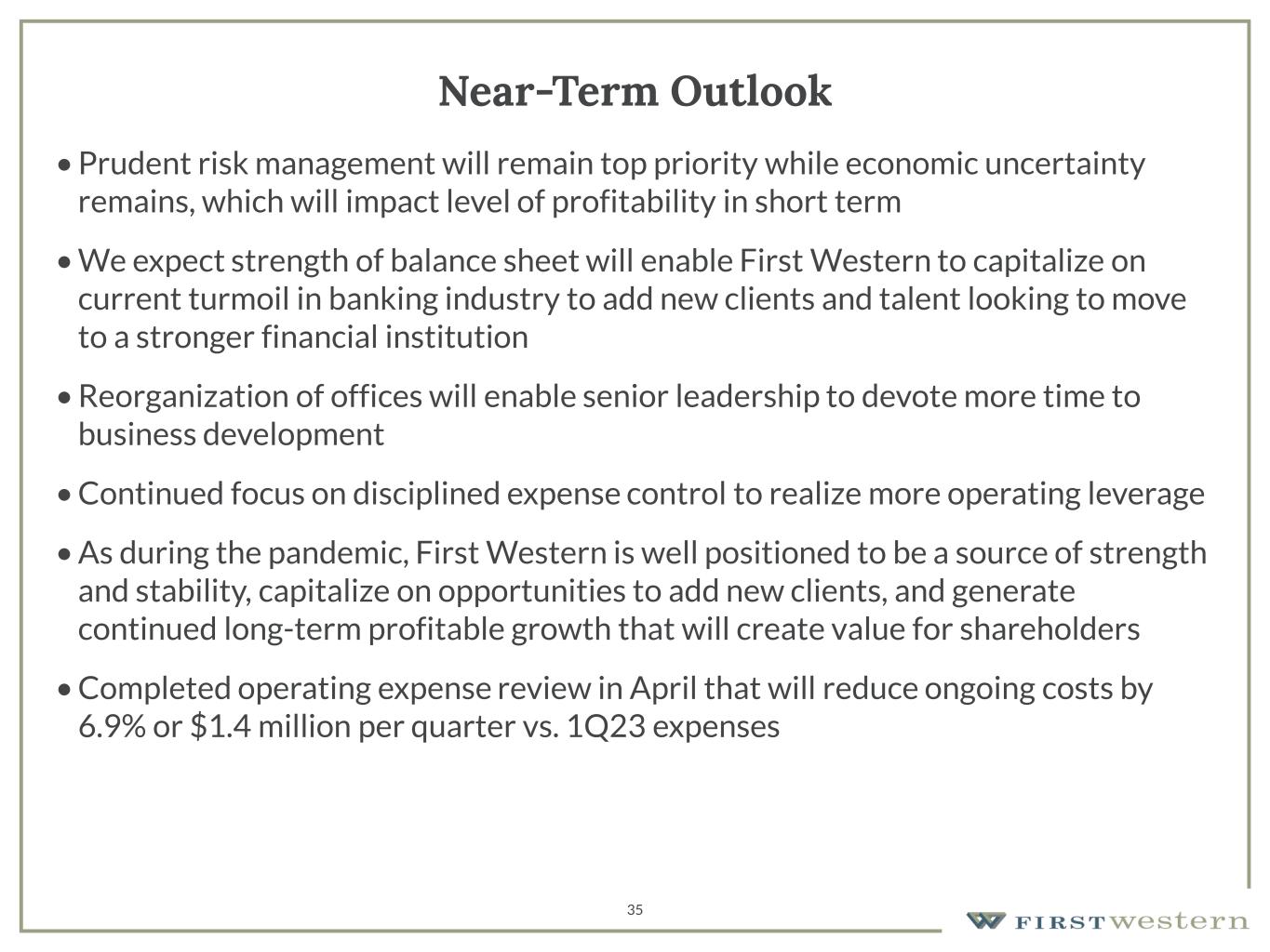 35 Near-Term Outlook • Prudent risk management will remain top priority while economic uncertainty remains, which will impact level of profitability in short term • We expect strength of balance sheet will enable First Western to capitalize on current turmoil in banking industry to add new clients and talent looking to move to a stronger financial institution • Reorganization of offices will enable senior leadership to devote more time to business development • Continued focus on disciplined expense control to realize more operating leverage • As during the pandemic, First Western is well positioned to be a source of strength and stability, capitalize on opportunities to add new clients, and generate continued long-term profitable growth that will create value for shareholders • Completed operating expense review in April that will reduce ongoing costs by 6.9% or $1.4 million per quarter vs. 1Q23 expenses