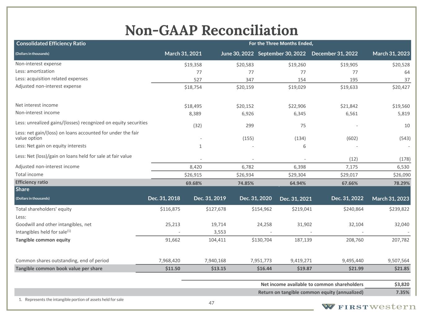 46 Non-GAAP Reconciliation Consolidated Efficiency Ratio For the Years Ended, (Dollars in thousands) 2016 2017 2018 2019 2020 2021 2022 Non-interest expense $49,823 $49,494 $50,182 $53,806 $59,552 $68,128 $79,106 Less: Amortization 747 784 831 374 14 17 308 Less: Acquisition related expenses - - - - 684 4,101 1,223 Less: Goodwill impairment - - - 1,572 - - - Less: Provision on other real estate owned - - - - 176 - - Less: Loss on assets held for sale - - - - 553 - - Plus: Gain on sale of LA fixed income team - - - - 62 - - Adjusted non-interest expense $49,076 $48,710 $49,351 $51,860 $58,187 $64,010 $77,575 Net interest income $24,457 $27,576 $30,624 $32,061 $46,102 $56,509 $83,204 Non-interest income 29,922 27,713 27,158 32,598 51,195 40,129 28,412 Less: Unrealized gains/(losses) recognized on equity securities - - (15) 21 15 (21) 342 Less: net gain/(loss) on loans accounted for under the fair value option - - - - - - (891) Less: Net gain on equity interests 114 81 - 119 - 489 7 Less: Net gain on sale of assets - - - 183 - - - Less: Net gain on loans held for sale - - - - - - (12) Total income $54,265 $55,208 $57,797 $64,336 $97,282 $96,170 $112,170 Efficiency ratio 90.4% 88.2% 85.4% 80.6% 59.8% 66.6% 69.2%