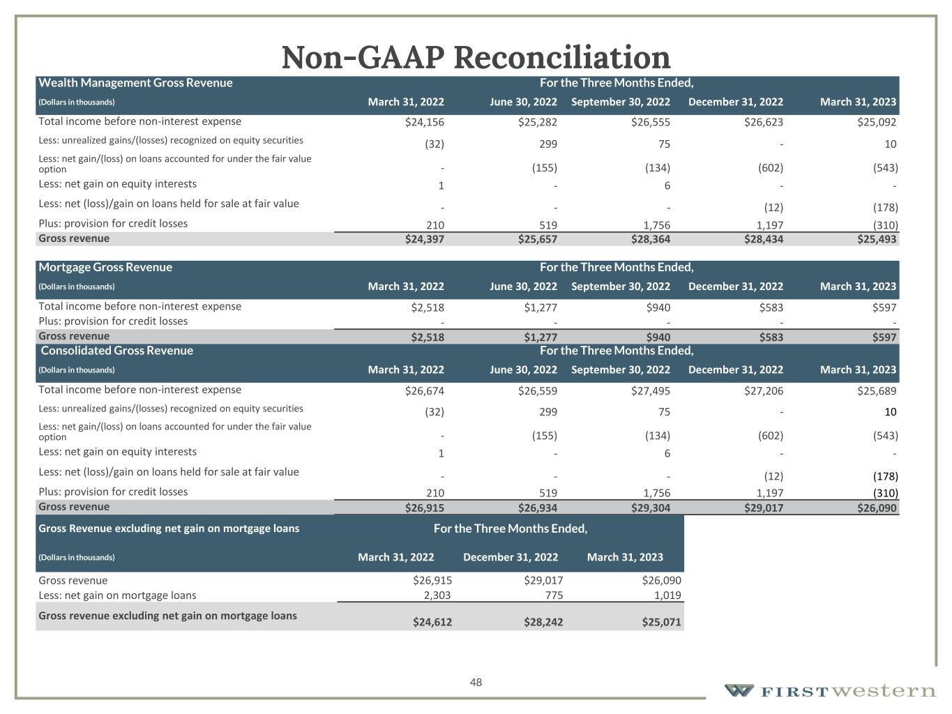 48 Non-GAAP Reconciliation Wealth Management Gross Revenue For the Three Months Ended, (Dollars in thousands) March 31, 2022 June 30, 2022 September 30, 2022 December 31, 2022 March 31, 2023 Total income before non-interest expense $24,156 $25,282 $26,555 $26,623 $25,092 Less: unrealized gains/(losses) recognized on equity securities (32) 299 75 - 10 Less: net gain/(loss) on loans accounted for under the fair value option - (155) (134) (602) (543) Less: net gain on equity interests 1 - 6 - - Less: net (loss)/gain on loans held for sale at fair value - - - (12) (178) Plus: provision for credit losses 210 519 1,756 1,197 (310) Gross revenue $24,397 $25,657 $28,364 $28,434 $25,493 Mortgage Gross Revenue For the Three Months Ended, (Dollars in thousands) March 31, 2022 June 30, 2022 September 30, 2022 December 31, 2022 March 31, 2023 Total income before non-interest expense $2,518 $1,277 $940 $583 $597 Plus: provision for credit losses - - - - - Gross revenue $2,518 $1,277 $940 $583 $597 Consolidated Gross Revenue For the Three Months Ended, (Dollars in thousands) March 31, 2022 June 30, 2022 September 30, 2022 December 31, 2022 March 31, 2023 Total income before non-interest expense $26,674 $26,559 $27,495 $27,206 $25,689 Less: unrealized gains/(losses) recognized on equity securities (32) 299 75 - 10 Less: net gain/(loss) on loans accounted for under the fair value option - (155) (134) (602) (543) Less: net gain on equity interests 1 - 6 - - Less: net (loss)/gain on loans held for sale at fair value - - - (12) (178) Plus: provision for credit losses 210 519 1,756 1,197 (310) Gross revenue $26,915 $26,934 $29,304 $29,017 $26,090 Gross Revenue excluding net gain on mortgage loans For the Three Months Ended, (Dollars in thousands) March 31, 2022 December 31, 2022 March 31, 2023 Gross revenue $26,915 $29,017 $26,090 Less: net gain on mortgage loans 2,303 775 1,019 Gross revenue excluding net gain on mortgage loans $24,612 $28,242 $25,071