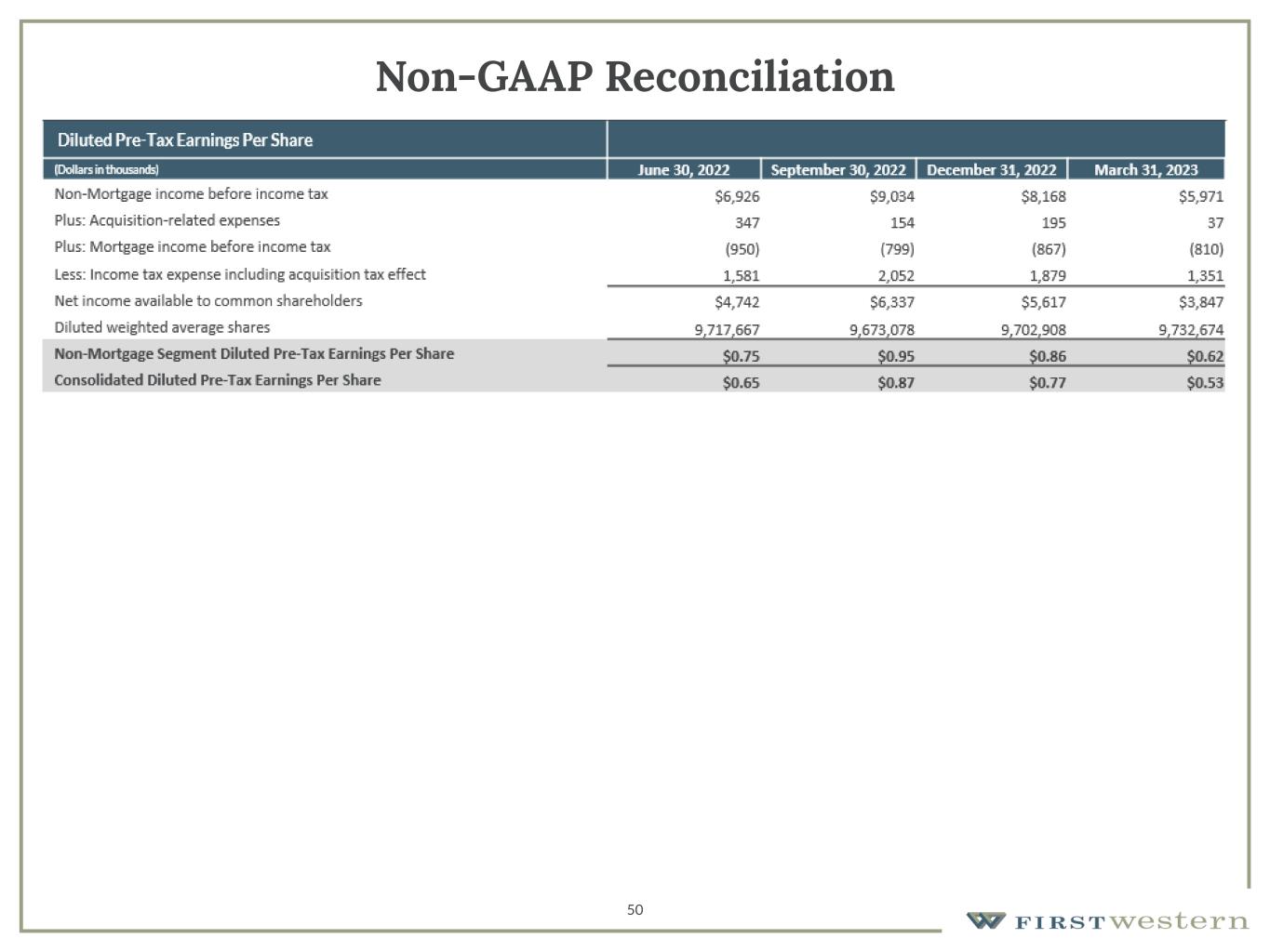 49 Non-GAAP Reconciliation Adjusted net income available to common shareholders For the Three Months Ended, (Dollars in thousands, except per share data) March 31, 2022 June 30, 2022 September 30, 2022 December 31, 2022 March 31, 2023 Net income available to common shareholders $5,524 $4,482 $6,221 $5,471 $3,820 Plus: acquisition related expense including tax impact 398 260 116 146 27 Adjusted net income to common shareholders $5,922 $4,742 $6,337 $5,617 $3,847 Adjusted diluted earnings per share For the Three Months Ended, (Dollars in thousands, except per share data) March 31, 2022 June 30, 2022 September 30, 2022 December 31, 2022 March 31, 2023 Diluted earnings per share $0.57 $0.46 $0.64 $0.56 $0.39 Plus: acquisition related expenses including tax impact 0.04 0.03 0.02 0.02 0.00 Adjusted diluted earnings per share $0.61 $0.49 $0.66 $0.58 $0.39 Allowance for credit losses to adjusted loans As of (Dollars in thousands) March 31, 2022 June 30, 2022 September 30, 2022 December 31, 2022 March 31, 2023 Total loans held for investment $1,931,134 $2,150,148 $2,354,898 $2,476,135 $2,475,084 Less: Acquired loans 323,563 287,623 248,573 234,717 - (1) Less: PPP loans 13,109 9,053 6,905 6,378 5,967 Less: Purchased loans accounted for under fair value 6.368 21,149 22,648 23,415 21,052 Loans excluding acquired and PPP 1,588,094 1,832,323 2,076,772 2,211,625 2,448,065 Allowance for credit losses 13,885 14,357 16,081 17,183 19,843 Allowance for credit losses to loans excluding PPP 0.87% 0.78% 0.77% 0.78% 0.81 % Pre-tax, pre-provision net income For the Three Months Ended, (Dollars in thousands) March 31, 2022 December 31, 2022 March 31, 2023 Income before income taxes $7,316 $7,301 $5,161 Plus: provision for credit losses 210 1,197 (310) Pre-tax, pre-provision net income $7,526 $8,498 $4,851 1. Subsequent to the adoption of CECL on January 1, 2023, acquired loans are included in the Allowance for Credit Losses and therefore are no longer excluded from the total adjusted loan calculation.