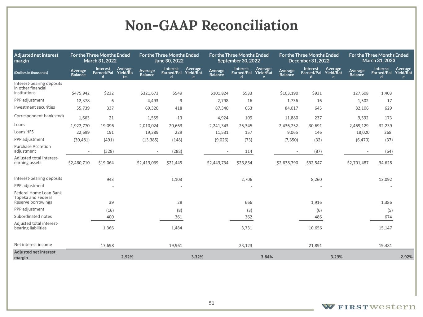 51 Non-GAAP Reconciliation Adjusted net interest margin For the Three Months Ended March 31, 2022 For the Three Months Ended June 30, 2022 For the Three Months Ended September 30, 2022 For the Three Months Ended December 31, 2022 For the Three Months Ended March 31, 2023 (Dollars in thousands) Average Balance Interest Earned/Pai d Average Yield/Ra te Average Balance Interest Earned/Pai d Average Yield/Rat e Average Balance Interest Earned/Pai d Average Yield/Rat e Average Balance Interest Earned/Pai d Average Yield/Rat e Average Balance Interest Earned/Pai d Average Yield/Rat e Interest-bearing deposits in other financial institutions $475,942 $232 $321,673 $549 $101,824 $533 $103,190 $931 127,608 1,403 PPP adjustment 12,378 6 4,493 9 2,798 16 1,736 16 1,502 17 Investment securities 55,739 337 69,320 418 87,340 653 84,017 645 82,106 629 Correspondent bank stock 1,663 21 1,555 13 4,924 109 11,880 237 9,592 173 Loans 1,922,770 19,096 2,010,024 20,663 2,241,343 25,345 2,436,252 30,691 2,469,129 32,239 Loans HFS 22,699 191 19,389 229 11,531 157 9,065 146 18,020 268 PPP adjustment (30,481) (491) (13,385) (148) (9,026) (73) (7,350) (32) (6,470) (37) Purchase Accretion adjustment - (328) - (288) - 114 - (87) - (64) Adjusted total Interest- earning assets $2,460,710 $19,064 $2,413,069 $21,445 $2,443,734 $26,854 $2,638,790 $32,547 $2,701,487 34,628 Interest-bearing deposits 943 1,103 2,706 8,260 13,092 PPP adjustment - - - - - Federal Home Loan Bank Topeka and Federal Reserve borrowings 39 28 666 1,916 1,386 PPP adjustment (16) (8) (3) (6) (5) Subordinated notes 400 361 362 486 674 Adjusted total interest- bearing liabilities 1,366 1,484 3,731 10,656 15,147 Net interest income 17,698 19,961 23,123 21,891 19,481 Adjusted net interest margin 2.92% 3.32% 3.84% 3.29% 2.92%