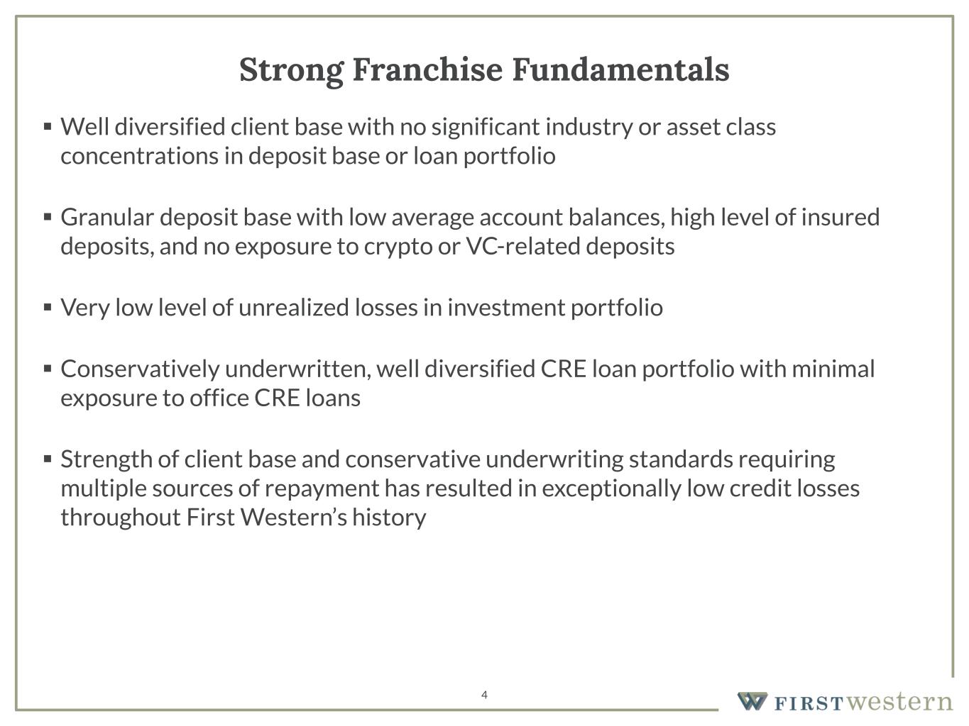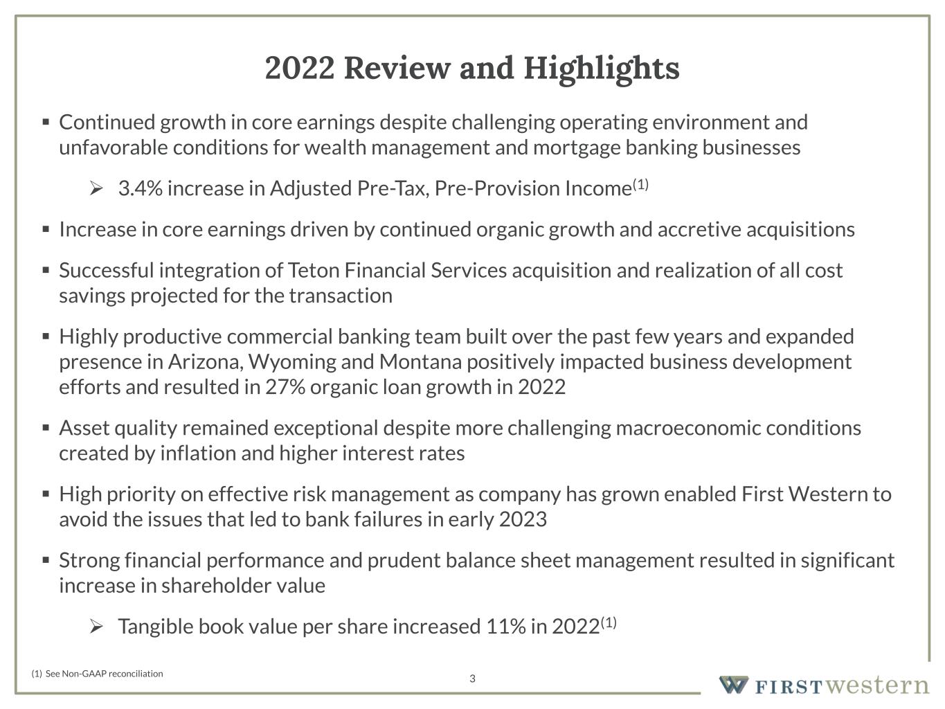 Safe Harbor 2 This presentation contains “forward-looking statements” within the meaning of Section 27A of the Securities Act of 1933, as amended, and Section 21E of the Securities Exchange Act of 1934, as amended. These forward-looking statements reflect the current views of First Western Financial, Inc.’s (“First Western”) management with respect to, among other things, future events and First Western’s financial performance. These statements are often, but not always, made through the use of words or phrases such as “may,” “should,” “could,” “predict,” “potential,” “believe,” “will likely result,” “expect,” “continue,” “will,” “anticipate,” “seek,” “estimate,” “intend,” “plan,” “project,” “future” “forecast,” “goal,” “target,” “would” and “outlook,” or the negative variations of those words or other comparable words of a future or forward-looking nature. These forward-looking statements are not historical facts, and are based on current expectations, estimates and projections about First Western’s industry, management’s beliefs and certain assumptions made by management, many of which, by their nature, are inherently uncertain and beyond First Western’s control. Accordingly, First Western cautions you that any such forward-looking statements are not guarantees of future performance and are subject to risks, assumptions and uncertainties that are difficult to predict. Although First Western believes that the expectations reflected in these forward-looking statements are reasonable as of the date made, actual results may prove to be materially different from the results expressed or implied by the forward-looking statements. Those following risks and uncertainties, among others, could cause actual results and future events to differ materially from those set forth or contemplated in the forward-looking statements: the COVID-19 pandemic and its effects; integration risks in connection with acquisitions; the risk of geographic concentration in Colorado, Arizona, Wyoming, Montana, and California; the risk of changes in the economy affecting real estate values and liquidity; the risk in our ability to continue to originate residential real estate loans and sell such loans; risks specific to commercial loans and borrowers; the risk of claims and litigation pertaining to our fiduciary responsibilities; the risk of competition for investment managers and professionals; the risk of fluctuation in the value of our investment securities; the risk of changes in interest rates; and the risk of the adequacy of our allowance for credit losses and the risk in our ability to maintain a strong core deposit base or other low-cost funding sources. Additional information regarding these and other risks and uncertainties to which our business and future financial performance are subject is contained in our Annual Report on Form 10-K filed with the U.S. Securities and Exchange Commission (“SEC”) on March 15, 2023 and other documents we file with the SEC from time to time. All subsequent written and oral forward-looking statements attributable to First Western or persons acting on First Western’s behalf are expressly qualified in their entirety by this paragraph. Forward-looking statements speak only as of the date of this presentation. First Western undertakes no obligation to publicly update or otherwise revise any forward- looking statements, whether as a result of new information, future events or otherwise (except as required by law). Certain of the information contained herein may be derived from information provided by industry sources. The Company believes that such information is accurate and the sources from which it has been obtained are reliable; however, the Company cannot guaranty the accuracy of such information and has not independently verified such information. This presentation contains certain non-GAAP financial measures intended to supplement, not substitute for, comparable GAAP measures. Reconciliations of non-GAAP financial measures to GAAP financial measures are provided at the end of this presentation. Numbers in the presentation may not sum due to rounding. Our common stock is not a deposit or savings account. Our common stock is not insured by the Federal Deposit Insurance Corporation or any governmental agency or instrumentality. This presentation is not an offer to sell any securities and it is not soliciting an offer to buy any securities in any state or jurisdiction where the offer or sale is not permitted. Neither the SEC nor any state securities commission has approved or disapproved of the securities of the Company or passed upon the accuracy or adequacy of this presentation. Any representation to the contrary is a criminal offense. Except as otherwise indicated, this presentation speaks as of the date hereof. The delivery of this presentation shall not, under any circumstances, create any implication that there has been no change in the affairs of the Company after the date hereof.