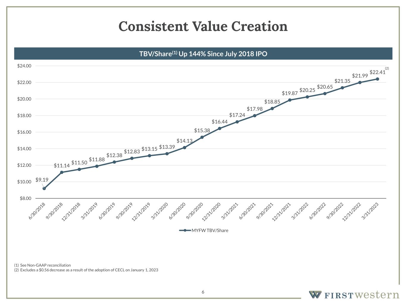 $9.19 $11.14 $11.50 $11.88 $12.38 $12.83 $13.15 $13.39 $14.13 $15.38 $16.44 $17.24 $17.98 $18.85 $19.87 $20.25 $20.65 $21.35 $21.99 $22.41 $8.00 $10.00 $12.00 $14.00 $16.00 $18.00 $20.00 $22.00 $24.00 MYFW TBV/Share 6 Consistent Value Creation (1) See Non-GAAP reconciliation (2) Excludes a $0.56 decrease as a result of the adoption of CECL on January 1, 2023 TBV/Share(1) Up 144% Since July 2018 IPO (2)