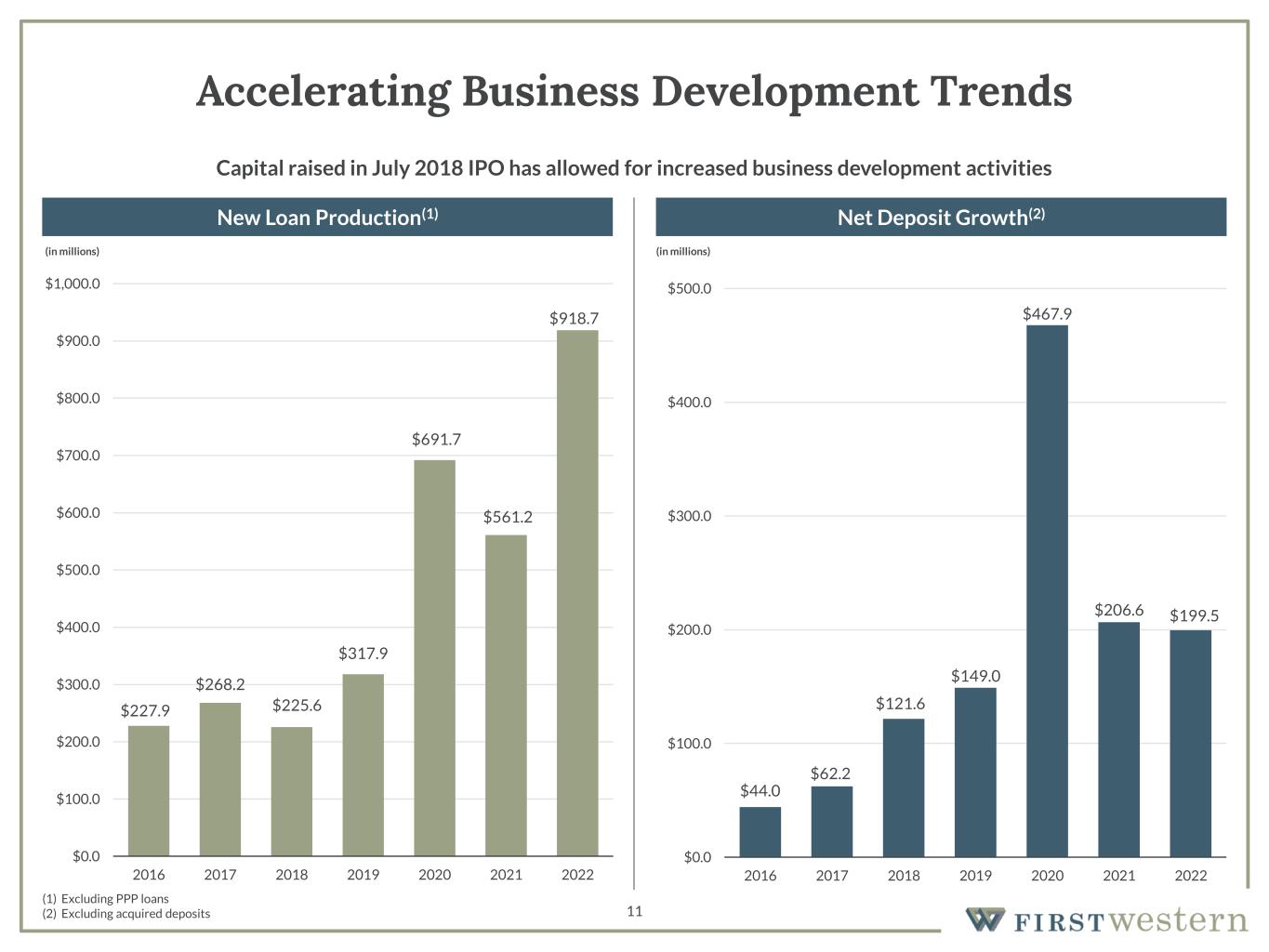 10 Strong Execution on Revenue Growth Strategies ▪ Accelerating business development, office expansion and accretive acquisitions all contributing to the balance sheet growth driving improved operating leverage and higher profitability ▪ M&A strategy continued with acquisition of Teton Financial Services ▪ Office expansion continued with hiring of teams to focus on Bozeman, MT market and deepen presence in Colorado and Arizona (in millions) Incremental Balance Sheet Growth (1/1/20 through 12/31/22) $1,238.5 $885.1 $234.7(1) $433.3 $0.0 $200.0 $400.0 $600.0 $800.0 $1,000.0 $1,200.0 $1,400.0 $1,600.0 Loans HFI Deposits Organic Growth Acquisition 148% Increase in Loans HFI 121% Increase in Total Deposits (1) Acquired growth represents remaining balances as of December 31, 2022 following payoffs/paydowns since the loans were acquired.