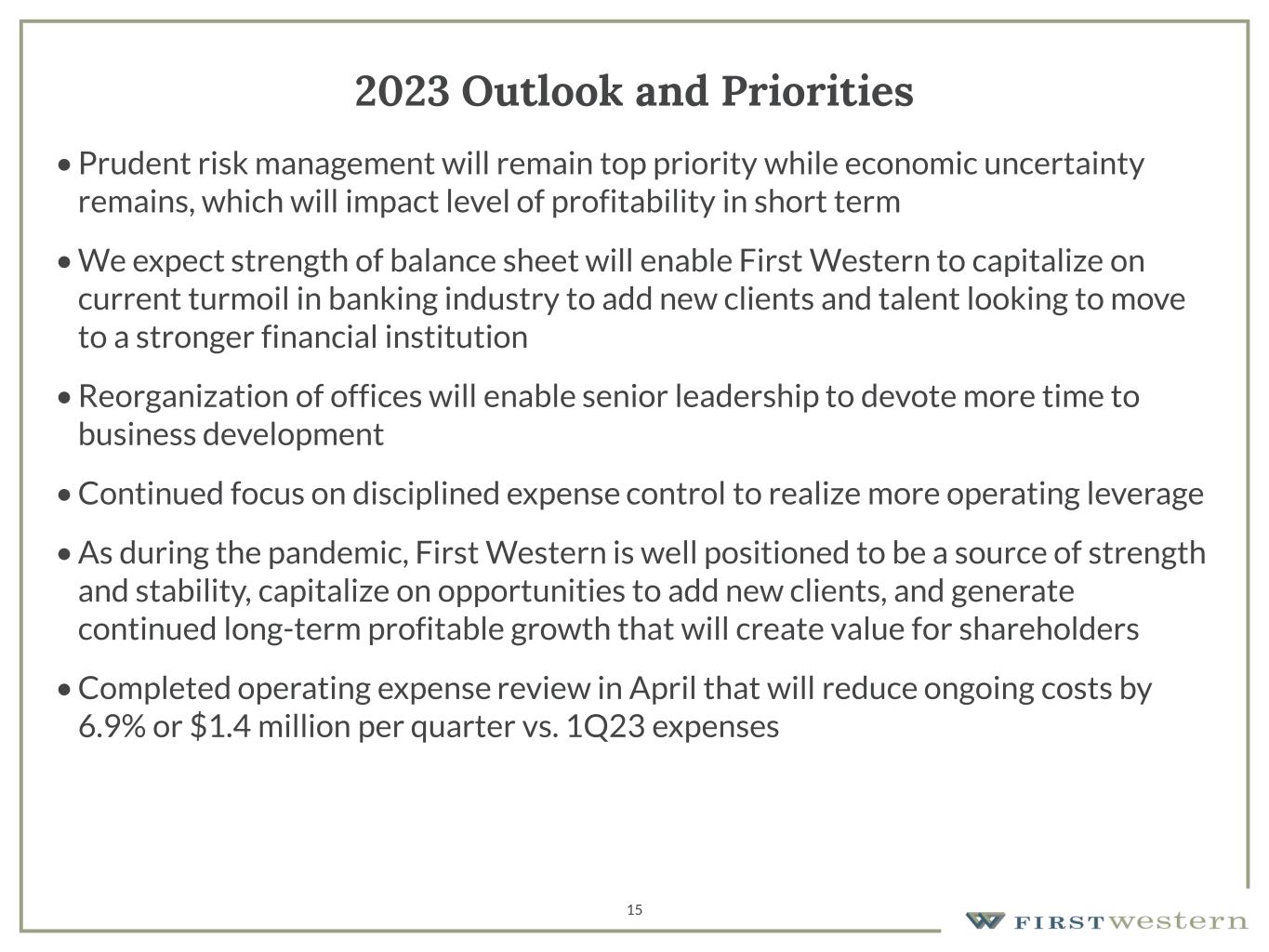 15 2023 Outlook and Priorities • Prudent risk management will remain top priority while economic uncertainty remains, which will impact level of profitability in short term • We expect strength of balance sheet will enable First Western to capitalize on current turmoil in banking industry to add new clients and talent looking to move to a stronger financial institution • Reorganization of offices will enable senior leadership to devote more time to business development • Continued focus on disciplined expense control to realize more operating leverage • As during the pandemic, First Western is well positioned to be a source of strength and stability, capitalize on opportunities to add new clients, and generate continued long-term profitable growth that will create value for shareholders • Completed operating expense review in April that will reduce ongoing costs by 6.9% or $1.4 million per quarter vs. 1Q23 expenses