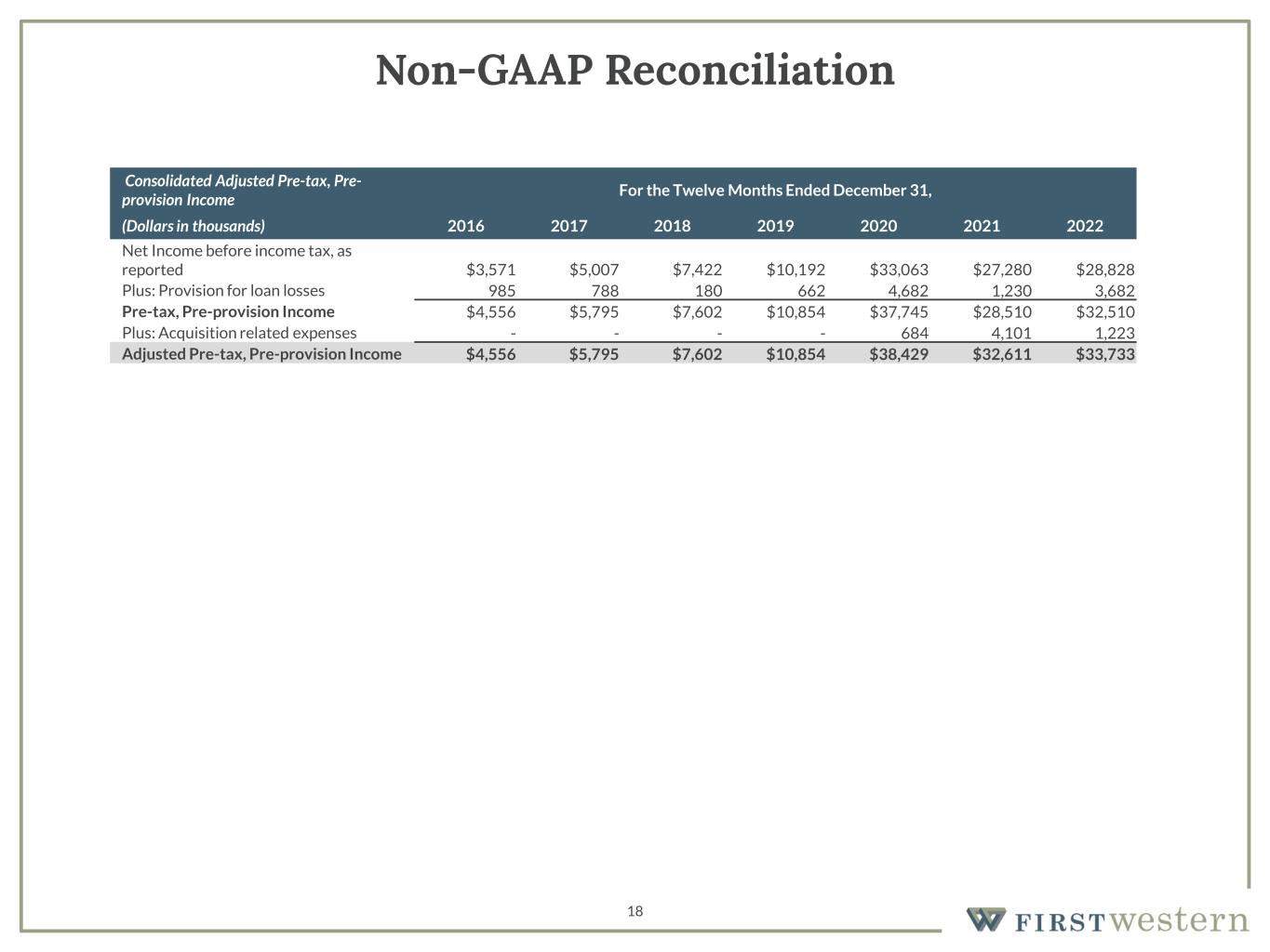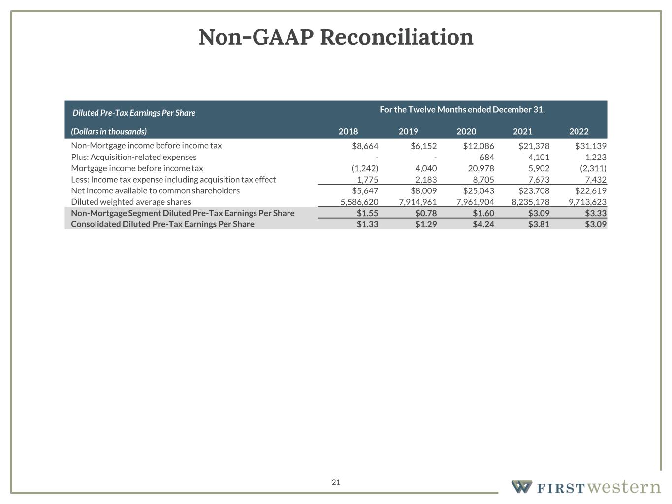 21 Non-GAAP Reconciliation Diluted Pre-Tax Earnings Per Share For the Twelve Months ended December 31, (Dollars in thousands) 2018 2019 2020 2021 2022 Non-Mortgage income before income tax $8,664 $6,152 $12,086 $21,378 $31,139 Plus: Acquisition-related expenses - - 684 4,101 1,223 Mortgage income before income tax (1,242) 4,040 20,978 5,902 (2,311) Less: Income tax expense including acquisition tax effect 1,775 2,183 8,705 7,673 7,432 Net income available to common shareholders $5,647 $8,009 $25,043 $23,708 $22,619 Diluted weighted average shares 5,586,620 7,914,961 7,961,904 8,235,178 9,713,623 Non-Mortgage Segment Diluted Pre-Tax Earnings Per Share $1.55 $0.78 $1.60 $3.09 $3.33 Consolidated Diluted Pre-Tax Earnings Per Share $1.33 $1.29 $4.24 $3.81 $3.09
