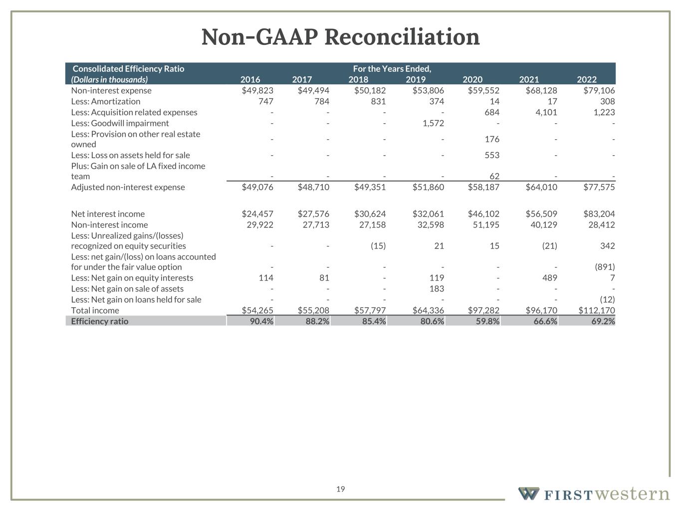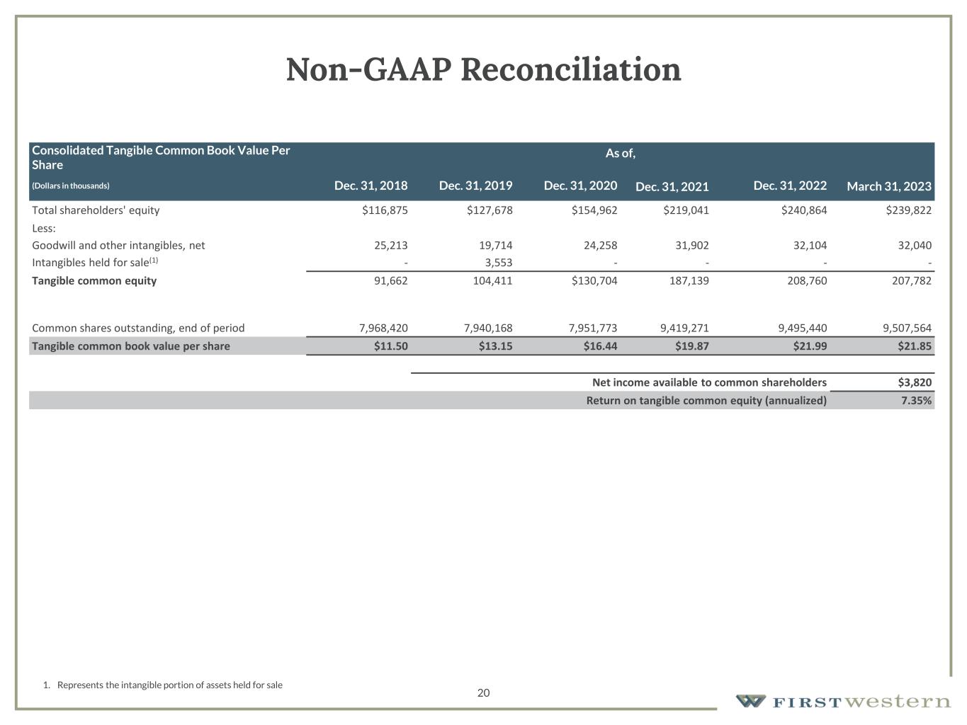 19 Non-GAAP Reconciliation Consolidated Efficiency Ratio For the Years Ended, (Dollars in thousands) 2016 2017 2018 2019 2020 2021 2022 Non-interest expense $49,823 $49,494 $50,182 $53,806 $59,552 $68,128 $79,106 Less: Amortization 747 784 831 374 14 17 308 Less: Acquisition related expenses - - - - 684 4,101 1,223 Less: Goodwill impairment - - - 1,572 - - - Less: Provision on other real estate owned - - - - 176 - - Less: Loss on assets held for sale - - - - 553 - - Plus: Gain on sale of LA fixed income team - - - - 62 - - Adjusted non-interest expense $49,076 $48,710 $49,351 $51,860 $58,187 $64,010 $77,575 Net interest income $24,457 $27,576 $30,624 $32,061 $46,102 $56,509 $83,204 Non-interest income 29,922 27,713 27,158 32,598 51,195 40,129 28,412 Less: Unrealized gains/(losses) recognized on equity securities - - (15) 21 15 (21) 342 Less: net gain/(loss) on loans accounted for under the fair value option - - - - - - (891) Less: Net gain on equity interests 114 81 - 119 - 489 7 Less: Net gain on sale of assets - - - 183 - - - Less: Net gain on loans held for sale - - - - - - (12) Total income $54,265 $55,208 $57,797 $64,336 $97,282 $96,170 $112,170 Efficiency ratio 90.4% 88.2% 85.4% 80.6% 59.8% 66.6% 69.2%