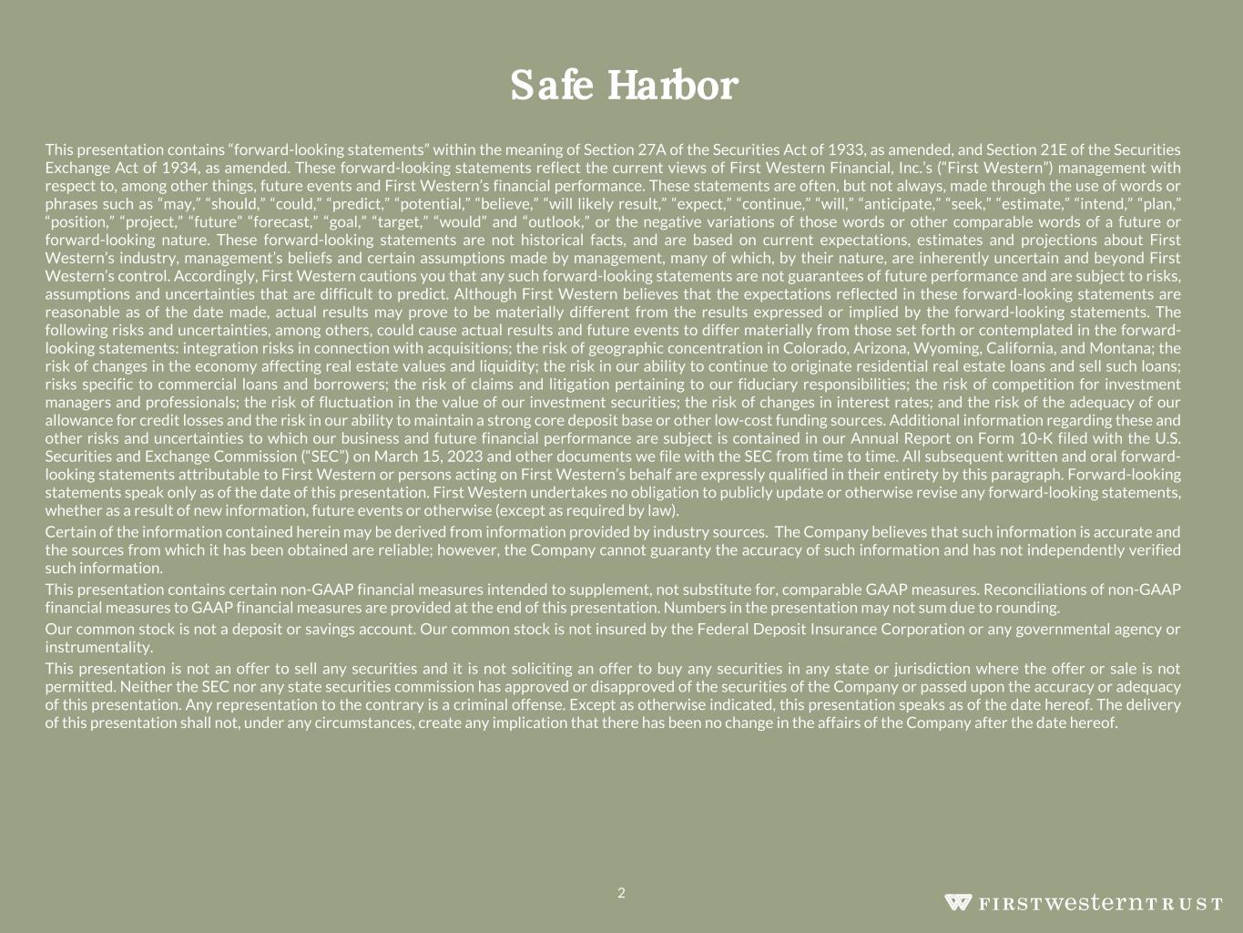Safe Harbor 2 This presentation contains “forward-looking statements” within the meaning of Section 27A of the Securities Act of 1933, as amended, and Section 21E of the Securities Exchange Act of 1934, as amended. These forward-looking statements reflect the current views of First Western Financial, Inc.’s (“First Western”) management with respect to, among other things, future events and First Western’s financial performance. These statements are often, but not always, made through the use of words or phrases such as “may,” “should,” “could,” “predict,” “potential,” “believe,” “will likely result,” “expect,” “continue,” “will,” “anticipate,” “seek,” “estimate,” “intend,” “plan,” “position,” “project,” “future” “forecast,” “goal,” “target,” “would” and “outlook,” or the negative variations of those words or other comparable words of a future or forward-looking nature. These forward-looking statements are not historical facts, and are based on current expectations, estimates and projections about First Western’s industry, management’s beliefs and certain assumptions made by management, many of which, by their nature, are inherently uncertain and beyond First Western’s control. Accordingly, First Western cautions you that any such forward-looking statements are not guarantees of future performance and are subject to risks, assumptions and uncertainties that are difficult to predict. Although First Western believes that the expectations reflected in these forward-looking statements are reasonable as of the date made, actual results may prove to be materially different from the results expressed or implied by the forward-looking statements. The following risks and uncertainties, among others, could cause actual results and future events to differ materially from those set forth or contemplated in the forward- looking statements: integration risks in connection with acquisitions; the risk of geographic concentration in Colorado, Arizona, Wyoming, California, and Montana; the risk of changes in the economy affecting real estate values and liquidity; the risk in our ability to continue to originate residential real estate loans and sell such loans; risks specific to commercial loans and borrowers; the risk of claims and litigation pertaining to our fiduciary responsibilities; the risk of competition for investment managers and professionals; the risk of fluctuation in the value of our investment securities; the risk of changes in interest rates; and the risk of the adequacy of our allowance for credit losses and the risk in our ability to maintain a strong core deposit base or other low-cost funding sources. Additional information regarding these and other risks and uncertainties to which our business and future financial performance are subject is contained in our Annual Report on Form 10-K filed with the U.S. Securities and Exchange Commission (“SEC”) on March 15, 2023 and other documents we file with the SEC from time to time. All subsequent written and oral forward- looking statements attributable to First Western or persons acting on First Western’s behalf are expressly qualified in their entirety by this paragraph. Forward-looking statements speak only as of the date of this presentation. First Western undertakes no obligation to publicly update or otherwise revise any forward-looking statements, whether as a result of new information, future events or otherwise (except as required by law). Certain of the information contained herein may be derived from information provided by industry sources. The Company believes that such information is accurate and the sources from which it has been obtained are reliable; however, the Company cannot guaranty the accuracy of such information and has not independently verified such information. This presentation contains certain non-GAAP financial measures intended to supplement, not substitute for, comparable GAAP measures. Reconciliations of non-GAAP financial measures to GAAP financial measures are provided at the end of this presentation. Numbers in the presentation may not sum due to rounding. Our common stock is not a deposit or savings account. Our common stock is not insured by the Federal Deposit Insurance Corporation or any governmental agency or instrumentality. This presentation is not an offer to sell any securities and it is not soliciting an offer to buy any securities in any state or jurisdiction where the offer or sale is not permitted. Neither the SEC nor any state securities commission has approved or disapproved of the securities of the Company or passed upon the accuracy or adequacy of this presentation. Any representation to the contrary is a criminal offense. Except as otherwise indicated, this presentation speaks as of the date hereof. The delivery of this presentation shall not, under any circumstances, create any implication that there has been no change in the affairs of the Company after the date hereof.