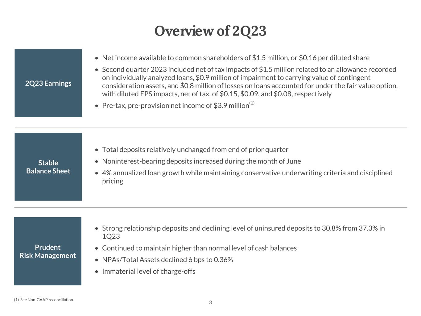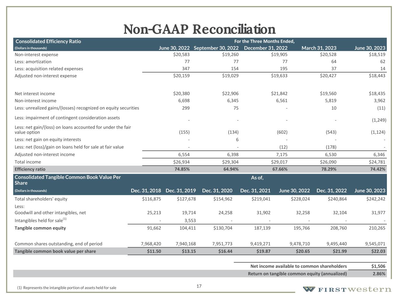 157 180 196 164 166 168 62 94 111 154 161 132 122 125 129 76 78 86 255 255 255 Chart color Table color Special Headlines Slide Headlines / Text on light background Primary Colors Secondary Colors Primary Background / Call Out Boxes / Text on dark background Chart color Table Color Tertiary Colors Chart color Table Color Chart Color Chart Color Approved Fonts AaBbCc 1 23 Lora (bold) Slide Headlines / Special Headlines AaBbCc 123 Lato (regular, bold, italics) Body Copy / Subheadings / Small Text Descriptions 17 Non-GAAP Reconciliation Consolidated Tangible Common Book Value Per Share As of, (Dollars in thousands) Dec. 31, 2018 Dec. 31, 2019 Dec. 31, 2020 Dec. 31, 2021 June 30, 2022 Dec. 31, 2022 June 30, 2023 Total shareholders' equity $116,875 $127,678 $154,962 $219,041 $228,024 $240,864 $242,242 Less: Goodwill and other intangibles, net 25,213 19,714 24,258 31,902 32,258 32,104 31,977 Intangibles held for sale(1) - 3,553 - - - - - Tangible common equity 91,662 104,411 $130,704 187,139 195,766 208,760 210,265 Common shares outstanding, end of period 7,968,420 7,940,168 7,951,773 9,419,271 9,478,710 9,495,440 9,545,071 Tangible common book value per share $11.50 $13.15 $16.44 $19.87 $20.65 $21.99 $22.03 Net income available to common shareholders $1,506 Return on tangible common equity (annualized) 2.86% (1) Represents the intangible portion of assets held for sale  Consolidated Efficiency Ratio For the Three Months Ended, (Dollars in thousands) June 30, 2022 September 30, 2022 December 31, 2022 March 31, 2023 June 30, 2023 Non-interest expense $20,583 $19,260 $19,905 $20,528 $18,519 Less: amortization 77 77 77 64 62 Less: acquisition related expenses 347 154 195 37 14 Adjusted non-interest expense $20,159 $19,029 $19,633 $20,427 $18,443 Net interest income $20,380 $22,906 $21,842 $19,560 $18,435 Non-interest income 6,698 6,345 6,561 5,819 3,962 Less: unrealized gains/(losses) recognized on equity securities 299 75 - 10 (11) Less: impairment of contingent consideration assets - - - - (1,249) Less: net gain/(loss) on loans accounted for under the fair value option (155) (134) (602) (543) (1,124) Less: net gain on equity interests - 6 - - - Less: net (loss)/gain on loans held for sale at fair value - - (12) (178) - Adjusted non-interest income 6,554 6,398 7,175 6,530 6,346 Total income $26,934 $29,304 $29,017 $26,090 $24,781 Efficiency ratio 74.85% 64.94% 67.66% 78.29% 74.42%