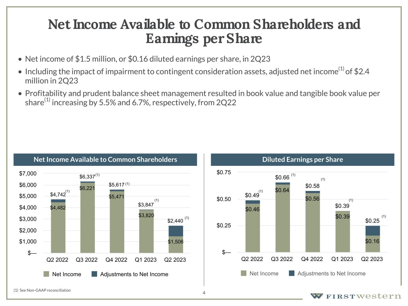 3 Overview of 2Q23 Prudent Risk Management 2Q23 Earnings Stable Balance Sheet • Total deposits relatively unchanged from end of prior quarter • Noninterest-bearing deposits increased during the month of June • 4% annualized loan growth while maintaining conservative underwriting criteria and disciplined pricing • Strong relationship deposits and declining level of uninsured deposits to 30.8% from 37.3% in 1Q23 • Continued to maintain higher than normal level of cash balances • NPAs/Total Assets declined 6 bps to 0.36% • Immaterial level of charge-offs • Net income available to common shareholders of $1.5 million, or $0.16 per diluted share • Second quarter 2023 included net of tax impacts of $1.5 million related to an allowance recorded on individually analyzed loans, $0.9 million of impairment to carrying value of contingent consideration assets, and $0.8 million of losses on loans accounted for under the fair value option, with diluted EPS impacts, net of tax, of $0.15, $0.09, and $0.08, respectively • Pre-tax, pre-provision net income of $3.9 million(1) (1) See Non-GAAP reconciliation