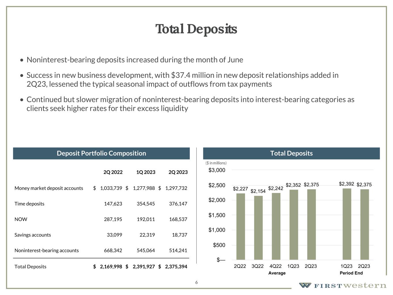 157 180 196 164 166 168 62 94 111 154 161 132 122 125 129 76 78 86 255 255 255 Chart color Table color Special Headlines Slide Headlines / Text on light background Primary Colors Secondary Colors Primary Background / Call Out Boxes / Text on dark background Chart color Table Color Tertiary Colors Chart color Table Color Chart Color Chart Color Approved Fonts AaBbCc 1 23 Lora (bold) Slide Headlines / Special Headlines AaBbCc 123 Lato (regular, bold, italics) Body Copy / Subheadings / Small Text Descriptions 5 Loan Portfolio • Total loans held for investment increased $26.8 million from prior quarter • Growth driven by CRE loans and draws on existing construction lines • Average rate on new loan production increased 23 bps to 7.41% compared to prior quarter, and was 7.79% in June 2Q 2022 1Q 2023 2Q 2023 Cash, Securities and Other $ 180,738 $ 157,308 $ 150,679 Consumer and Other 26,706 22,183 21,866 Construction and Development 162,426 283,999 313,227 1-4 Family Residential 732,725 889,782 878,670 Non-Owner Occupied CRE 489,111 536,679 561,880 Owner Occupied CRE 224,597 223,449 218,651 Commercial and Industrial 312,696 340,632 338,679 Total $ 2,128,999 $ 2,454,032 $ 2,483,652 Loans accounted for at fair value(2) 21,149 21,052 18,274 Total Loans HFI $ 2,150,148 $ 2,475,084 $ 2,501,926 Loans held-for-sale (HFS) 26,202 9,873 19,746 Total Loans $ 2,176,350 $ 2,484,957 $ 2,521,672 (1) Represents unpaid principal balance. Excludes deferred (fees) costs, and amortized premium/ (unaccreted discount). (2) Excludes fair value adjustments on loans accounted for under the fair value option. ($ in thousands, as of quarter end) Loan Portfolio Composition(1) Loan Portfolio Details Loan Production & Loan Payoffs Total Loans(1) $2,029 $2,253 $2,445 $2,487 $2,487 $2,485 $2,522 2Q22 3Q22 4Q22 1Q23 2Q23 1Q23 2Q23 $— $400 $800 $1,200 $1,600 $2,000 $2,400 $2,800 $3,200 Average Period End