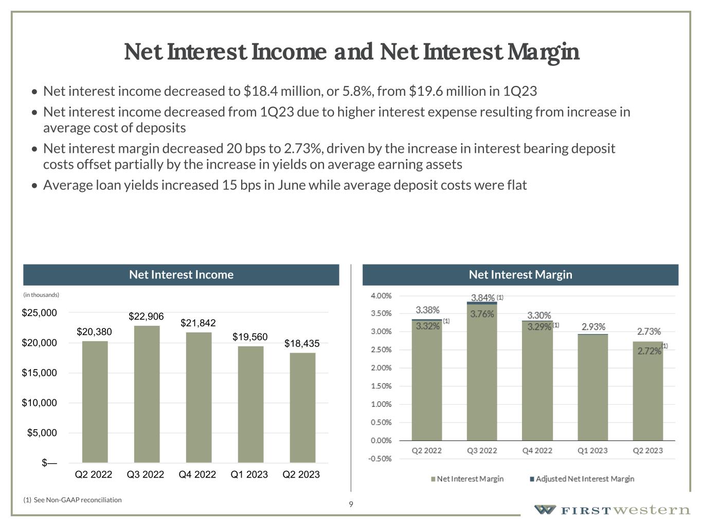 157 180 196 164 166 168 62 94 111 154 161 132 122 125 129 76 78 86 255 255 255 Chart color Table color Special Headlines Slide Headlines / Text on light background Primary Colors Secondary Colors Primary Background / Call Out Boxes / Text on dark background Chart color Table Color Tertiary Colors Chart color Table Color Chart Color Chart Color Approved Fonts AaBbCc 1 23 Lora (bold) Slide Headlines / Special Headlines AaBbCc 123 Lato (regular, bold, italics) Body Copy / Subheadings / Small Text Descriptions (1) See Non-GAAP reconciliation Gross Revenue • Gross revenue(1) declined 5.0% from prior quarter • Decrease primarily driven by a decrease in net interest income as a result of higher interest expense driven by higher deposit costs, offset partially by higher interest income • Net interest income decline due to NIM pressure 2Q23 Gross Revenue(1) Gross Revenue(1) 8 $26.9 $29.3 $29.0 $26.1 $24.8 Wealth Management Mortgage Q2 2022 Q3 2022 Q4 2022 Q1 2023 Q2 2023 $— $5.0 $10.0 $15.0 $20.0 $25.0 $30.0 $35.0