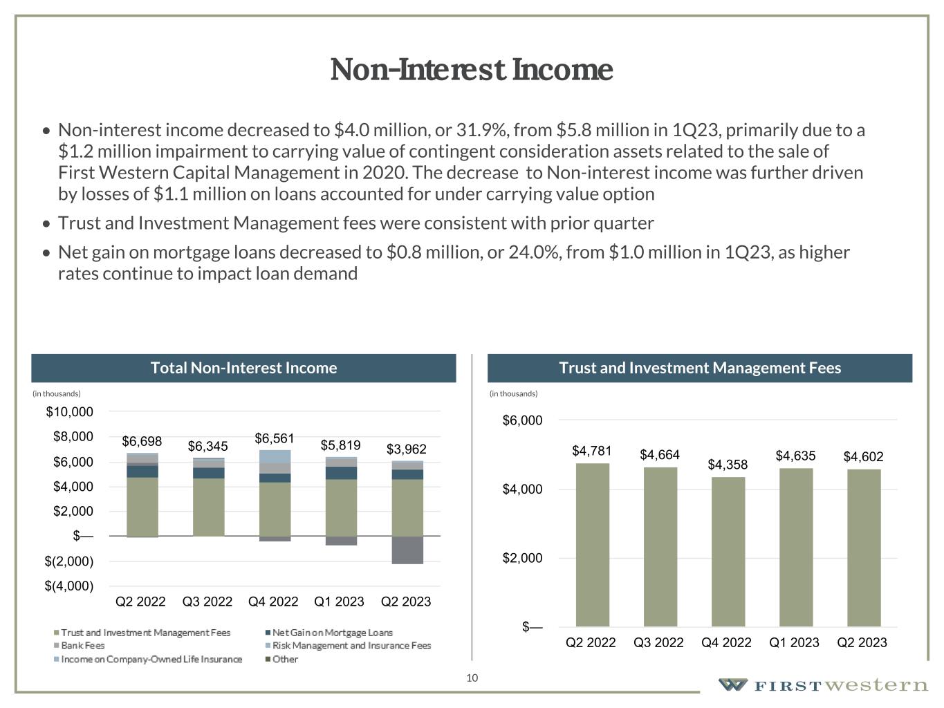 157 180 196 164 166 168 62 94 111 154 161 132 122 125 129 76 78 86 255 255 255 Chart color Table color Special Headlines Slide Headlines / Text on light background Primary Colors Secondary Colors Primary Background / Call Out Boxes / Text on dark background Chart color Table Color Tertiary Colors Chart color Table Color Chart Color Chart Color Approved Fonts AaBbCc 1 23 Lora (bold) Slide Headlines / Special Headlines AaBbCc 123 Lato (regular, bold, italics) Body Copy / Subheadings / Small Text Descriptions 9 Net Interest Income and Net Interest Margin • Net interest income decreased to $18.4 million, or 5.8%, from $19.6 million in 1Q23 • Net interest income decreased from 1Q23 due to higher interest expense resulting from increase in average cost of deposits • Net interest margin decreased 20 bps to 2.73%, driven by the increase in interest bearing deposit costs offset partially by the increase in yields on average earning assets • Average loan yields increased 15 bps in June while average deposit costs were flat (in thousands) (1) See Non-GAAP reconciliation Net Interest Income Net Interest Margin $20,380 $22,906 $21,842 $19,560 $18,435 Q2 2022 Q3 2022 Q4 2022 Q1 2023 Q2 2023 $— $5,000 $10,000 $15,000 $20,000 $25,000