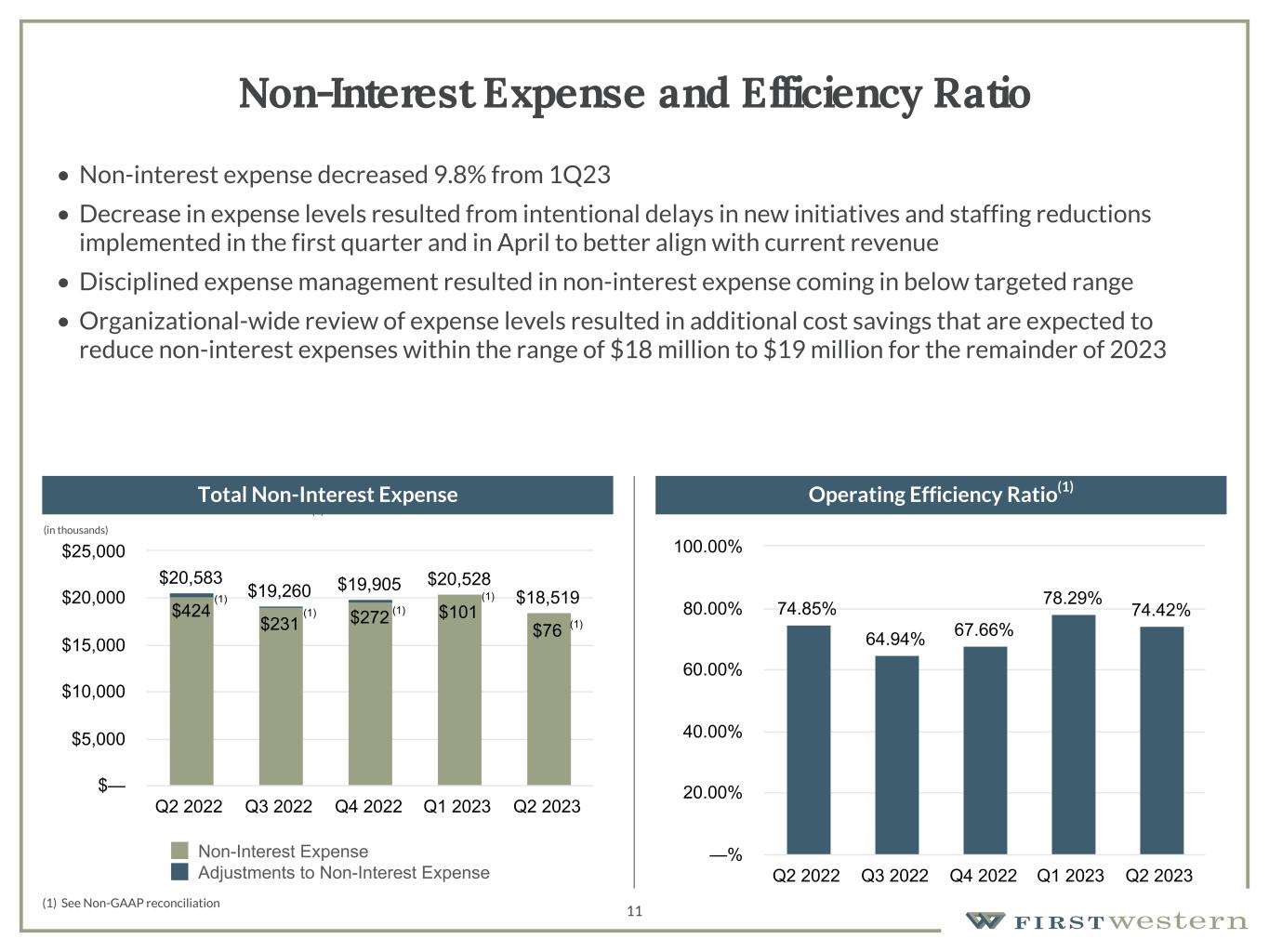 157 180 196 164 166 168 62 94 111 154 161 132 122 125 129 76 78 86 255 255 255 Chart color Table color Special Headlines Slide Headlines / Text on light background Primary Colors Secondary Colors Primary Background / Call Out Boxes / Text on dark background Chart color Table Color Tertiary Colors Chart color Table Color Chart Color Chart Color Approved Fonts AaBbCc 1 23 Lora (bold) Slide Headlines / Special Headlines AaBbCc 123 Lato (regular, bold, italics) Body Copy / Subheadings / Small Text Descriptions 10 Non-Interest Income • Non-interest income decreased to $4.0 million, or 31.9%, from $5.8 million in 1Q23, primarily due to a $1.2 million impairment to carrying value of contingent consideration assets related to the sale of First Western Capital Management in 2020. The decrease to Non-interest income was further driven by losses of $1.1 million on loans accounted for under carrying value option • Trust and Investment Management fees were consistent with prior quarter • Net gain on mortgage loans decreased to $0.8 million, or 24.0%, from $1.0 million in 1Q23, as higher rates continue to impact loan demand (in thousands)(in thousands) Total Non-Interest Income Trust and Investment Management Fees $6,698 $6,561 $5,819 $3,962$6,345 Q2 2022 Q3 2022 Q4 2022 Q1 2023 Q2 2023 $(4,000) $(2,000) $— $2,000 $4,000 $6,000 $8,000 $10,000 $4,781 $4,664 $4,358 $4,635 $4,602 Q2 2022 Q3 2022 Q4 2022 Q1 2023 Q2 2023 $— $2,000 $4,000 $6,000
