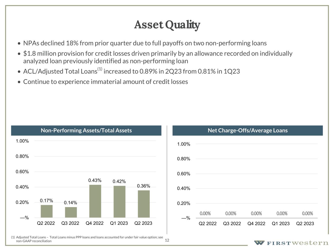 157 180 196 164 166 168 62 94 111 154 161 132 122 125 129 76 78 86 255 255 255 Chart color Table color Special Headlines Slide Headlines / Text on light background Primary Colors Secondary Colors Primary Background / Call Out Boxes / Text on dark background Chart color Table Color Tertiary Colors Chart color Table Color Chart Color Chart Color Approved Fonts AaBbCc 1 23 Lora (bold) Slide Headlines / Special Headlines AaBbCc 123 Lato (regular, bold, italics) Body Copy / Subheadings / Small Text Descriptions 11 Non-Interest Expense and Efficiency Ratio • Non-interest expense decreased 9.8% from 1Q23 • Decrease in expense levels resulted from intentional delays in new initiatives and staffing reductions implemented in the first quarter and in April to better align with current revenue • Disciplined expense management resulted in non-interest expense coming in below targeted range • Organizational-wide review of expense levels resulted in additional cost savings that are expected to reduce non-interest expenses within the range of $18 million to $19 million for the remainder of 2023 (1) (1) See Non-GAAP reconciliation Total Non-Interest Expense Operating Efficiency Ratio(1) (in thousands) (1) (1) (1) (1) $20,583 $19,260 $19,905 $20,528 $18,519 $424 $231 $272 $101 $76 Non-Interest Expense Adjustments to Non-Interest Expense Q2 2022 Q3 2022 Q4 2022 Q1 2023 Q2 2023 $— $5,000 $10,000 $15,000 $20,000 $25,000 74.85% 64.94% 67.66% 78.29% 74.42% Q2 2022 Q3 2022 Q4 2022 Q1 2023 Q2 2023 —% 20.00% 40.00% 60.00% 80.00% 100.00% (1) (1) (1)(1) (1)