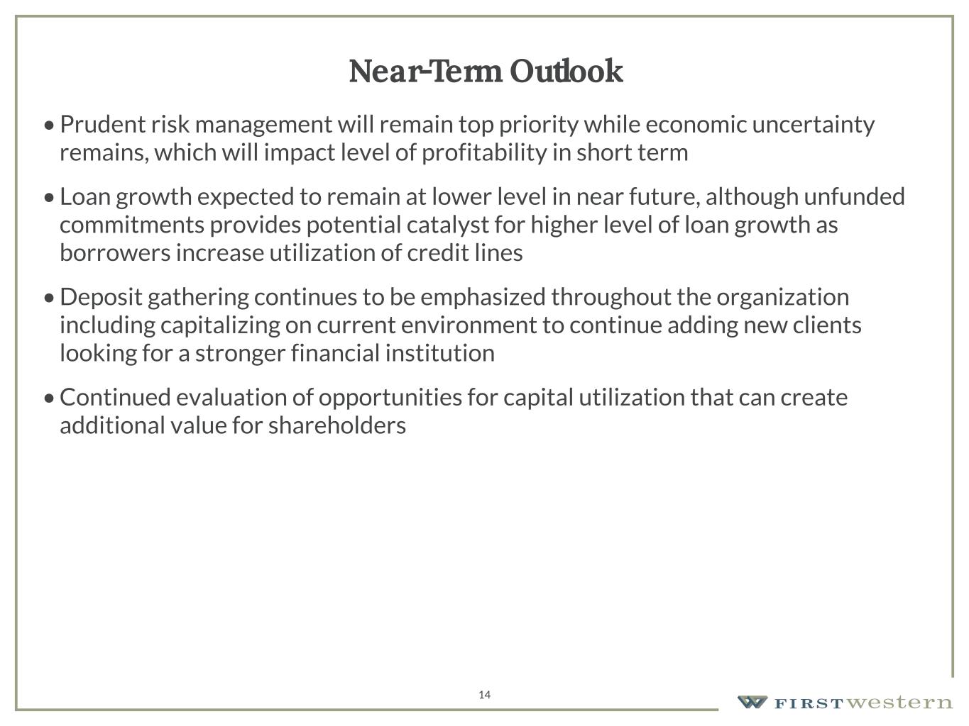 157 180 196 164 166 168 62 94 111 154 161 132 122 125 129 76 78 86 255 255 255 Chart color Table color Special Headlines Slide Headlines / Text on light background Primary Colors Secondary Colors Primary Background / Call Out Boxes / Text on dark background Chart color Table Color Tertiary Colors Chart color Table Color Chart Color Chart Color Approved Fonts AaBbCc 1 23 Lora (bold) Slide Headlines / Special Headlines AaBbCc 123 Lato(regular, bold, italics) Body Copy / Subheadings / Small Text Descriptions 14 Near-Term Outlook • Prudent risk management will remain top priority while economic uncertainty remains, which will impact level of profitability in short term • Loan growth expected to remain at lower level in near future, although unfunded commitments provides potential catalyst for higher level of loan growth as borrowers increase utilization of credit lines • Deposit gathering continues to be emphasized throughout the organization including capitalizing on current environment to continue adding new clients looking for a stronger financial institution • Continued evaluation of opportunities for capital utilization that can create additional value for shareholders