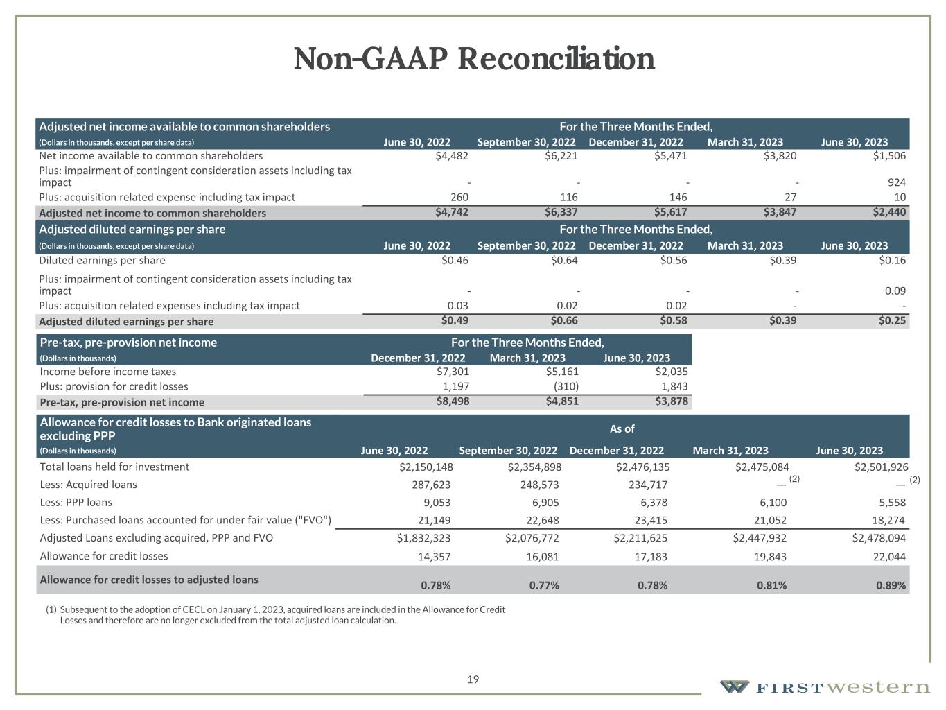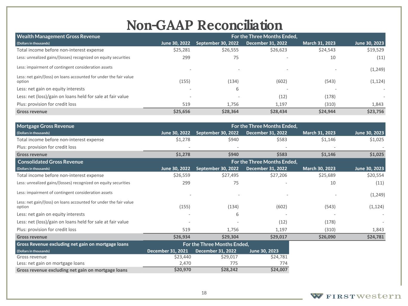 157 180 196 164 166 168 62 94 111 154 161 132 122 125 129 76 78 86 255 255 255 Chart color Table color Special Headlines Slide Headlines / Text on light background Primary Colors Secondary Colors Primary Background / Call Out Boxes / Text on dark background Chart color Table Color Tertiary Colors Chart color Table Color Chart Color Chart Color Approved Fonts AaBbCc 1 23 Lora (bold) Slide Headlines / Special Headlines AaBbCc 123 Lato (regular, bold, italics) Body Copy / Subheadings / Small Text Descriptions 18 Non-GAAP Reconciliation Wealth Management Gross Revenue For the Three Months Ended, (Dollars in thousands) June 30, 2022 September 30, 2022 December 31, 2022 March 31, 2023 June 30, 2023 Total income before non-interest expense $25,281 $26,555 $26,623 $24,543 $19,529 Less: unrealized gains/(losses) recognized on equity securities 299 75 - 10 (11) Less: impairment of contingent consideration assets - - - - (1,249) Less: net gain/(loss) on loans accounted for under the fair value option (155) (134) (602) (543) (1,124) Less: net gain on equity interests - 6 - - - Less: net (loss)/gain on loans held for sale at fair value - - (12) (178) - Plus: provision for credit loss 519 1,756 1,197 (310) 1,843 Gross revenue $25,656 $28,364 $28,434 $24,944 $23,756 Mortgage Gross Revenue For the Three Months Ended, (Dollars in thousands) June 30, 2022 September 30, 2022 December 31, 2022 March 31, 2023 June 30, 2023 Total income before non-interest expense $1,278 $940 $583 $1,146 $1,025 Plus: provision for credit loss - - - - - Gross revenue $1,278 $940 $583 $1,146 $1,025  Consolidated Gross Revenue For the Three Months Ended, (Dollars in thousands) June 30, 2022 September 30, 2022 December 31, 2022 March 30, 2023 June 30, 2023 Total income before non-interest expense $26,559 $27,495 $27,206 $25,689 $20,554 Less: unrealized gains/(losses) recognized on equity securities 299 75 - 10 (11) Less: impairment of contingent consideration assets - - - - (1,249) Less: net gain/(loss) on loans accounted for under the fair value option (155) (134) (602) (543) (1,124) Less: net gain on equity interests - 6 - - - Less: net (loss)/gain on loans held for sale at fair value - - (12) (178) - Plus: provision for credit loss 519 1,756 1,197 (310) 1,843 Gross revenue $26,934 $29,304 $29,017 $26,090 $24,781 Gross Revenue excluding net gain on mortgage loans For the Three Months Ended, (Dollars in thousands) December 31, 2021 December 31, 2022 June 30, 2023 Gross revenue $23,440 $29,017 $24,781 Less: net gain on mortgage loans 2,470 775 774 Gross revenue excluding net gain on mortgage loans $20,970 $28,242 $24,007