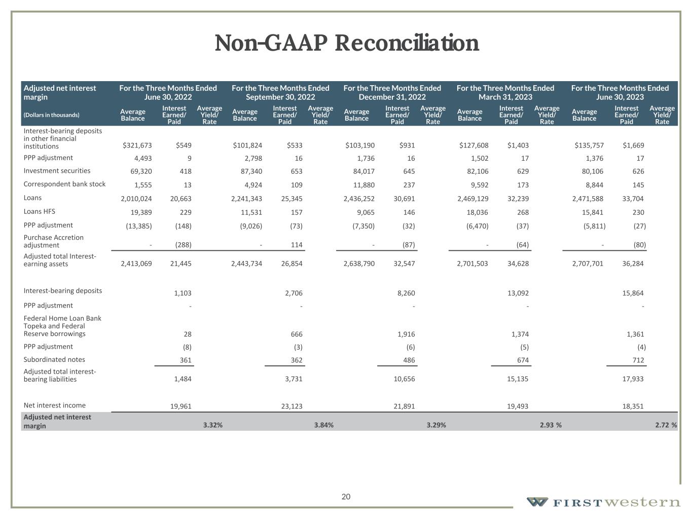 157 180 196 164 166 168 62 94 111 154 161 132 122 125 129 76 78 86 255 255 255 Chart color Table color Special Headlines Slide Headlines / Text on light background Primary Colors Secondary Colors Primary Background / Call Out Boxes / Text on dark background Chart color Table Color Tertiary Colors Chart color Table Color Chart Color Chart Color Approved Fonts AaBbCc 1 23 Lora (bold) Slide Headlines / Special Headlines AaBbCc 123 Lato (regular, bold, italics) Body Copy / Subheadings / Small Text Descriptions 20 Non-GAAP Reconciliation Adjusted net interest margin For the Three Months Ended June 30, 2022 For the Three Months Ended September 30, 2022 For the Three Months Ended December 31, 2022 For the Three Months Ended March 31, 2023 For the Three Months Ended June 30, 2023 (Dollars in thousands) Average Balance Interest Earned/ Paid Average Yield/ Rate Average Balance Interest Earned/ Paid Average Yield/ Rate Average Balance Interest Earned/ Paid Average Yield/ Rate Average Balance Interest Earned/ Paid Average Yield/ Rate Average Balance Interest Earned/ Paid Average Yield/ Rate Interest-bearing deposits in other financial institutions $321,673 $549 $101,824 $533 $103,190 $931 $127,608 $1,403 $135,757 $1,669 PPP adjustment 4,493 9 2,798 16 1,736 16 1,502 17 1,376 17 Investment securities 69,320 418 87,340 653 84,017 645 82,106 629 80,106 626 Correspondent bank stock 1,555 13 4,924 109 11,880 237 9,592 173 8,844 145 Loans 2,010,024 20,663 2,241,343 25,345 2,436,252 30,691 2,469,129 32,239 2,471,588 33,704 Loans HFS 19,389 229 11,531 157 9,065 146 18,036 268 15,841 230 PPP adjustment (13,385) (148) (9,026) (73) (7,350) (32) (6,470) (37) (5,811) (27) Purchase Accretion adjustment - (288) - 114 - (87) - (64) - (80) Adjusted total Interest- earning assets 2,413,069 21,445 2,443,734 26,854 2,638,790 32,547 2,701,503 34,628 2,707,701 36,284 Interest-bearing deposits 1,103 2,706 8,260 13,092 15,864 PPP adjustment - - - - - Federal Home Loan Bank Topeka and Federal Reserve borrowings 28 666 1,916 1,374 1,361 PPP adjustment (8) (3) (6) (5) (4) Subordinated notes 361 362 486 674 712 Adjusted total interest- bearing liabilities 1,484 3,731 10,656 15,135 17,933 Net interest income 19,961 23,123 21,891 19,493 18,351 Adjusted net interest margin 3.32% 3.84% 3.29% 2.93 % 2.72 %