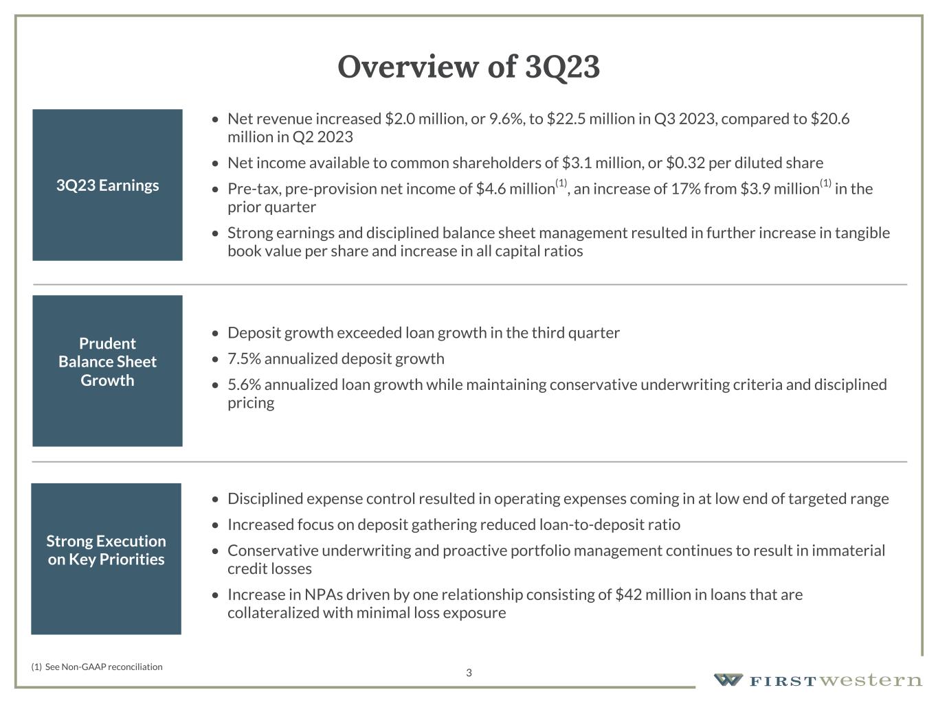 157 180 196 164 166 168 62 94 111 154 161 132 122 125 129 76 78 86 255 255 255 Chart color Table color Special Headlines Slide Headlines / Text on light background Primary Colors Secondary Colors Primary Background / Call Out Boxes / Text on dark background Chart color Table Color Tertiary Colors Chart color Table Color Chart Color Chart Color Approved Fonts AaBbCc 123 Lora (bold) Slide Headlines / Special Headlines AaBbCc 123 Lato(regular, bold, italics) Body Copy / Subheadings / Small Text Descriptions Overview of 3Q23 3Q23 Earnings • Net revenue increased $2.0 million, or 9.6%, to $22.5 million in Q3 2023, compared to $20.6 million in Q2 2023 • Net income available to common shareholders of $3.1 million, or $0.32 per diluted share • Pre-tax, pre-provision net income of $4.6 million(1), an increase of 17% from $3.9 million(1) in the prior quarter • Strong earnings and disciplined balance sheet management resulted in further increase in tangible book value per share and increase in all capital ratios Prudent Balance Sheet Growth • Deposit growth exceeded loan growth in the third quarter • 7.5% annualized deposit growth • 5.6% annualized loan growth while maintaining conservative underwriting criteria and disciplined pricing Strong Execution on Key Priorities • Disciplined expense control resulted in operating expenses coming in at low end of targeted range • Increased focus on deposit gathering reduced loan-to-deposit ratio • Conservative underwriting and proactive portfolio management continues to result in immaterial credit losses • Increase in NPAs driven by one relationship consisting of $42 million in loans that are collateralized with minimal loss exposure (1) See Non-GAAP reconciliation 3