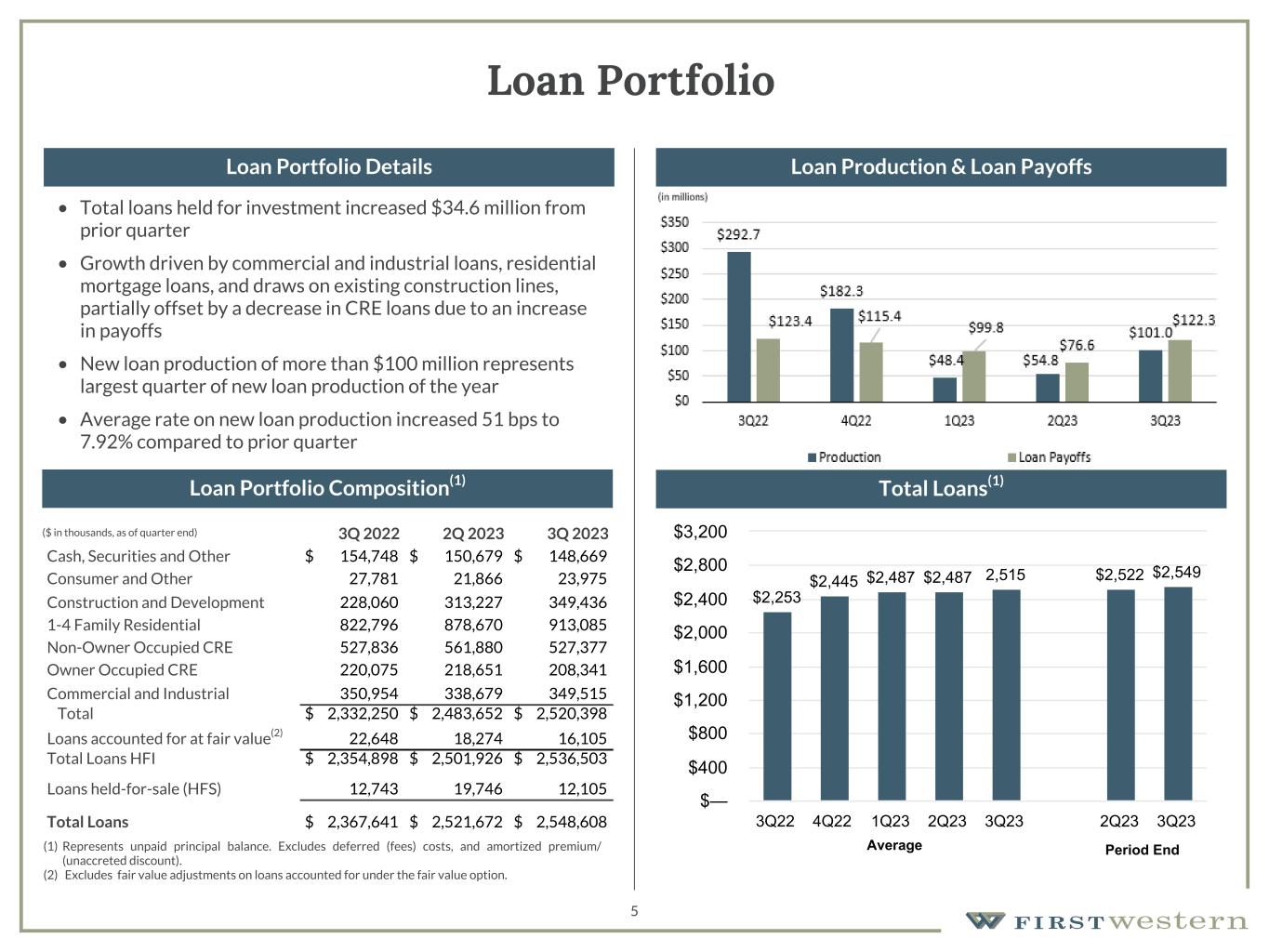 157 180 196 164 166 168 62 94 111 154 161 132 122 125 129 76 78 86 255 255 255 Chart color Table color Special Headlines Slide Headlines / Text on light background Primary Colors Secondary Colors Primary Background / Call Out Boxes / Text on dark background Chart color Table Color Tertiary Colors Chart color Table Color Chart Color Chart Color Approved Fonts AaBbCc 123 Lora (bold) Slide Headlines / Special Headlines AaBbCc 123 Lato(regular, bold, italics) Body Copy / Subheadings / Small Text Descriptions 4 Net Income Available to Common Shareholders and Earnings per Share • Net income of $3.1 million, or $0.32 diluted earnings per share, in 3Q23 • Profitability and prudent balance sheet management resulted in book value and tangible book value per share(1) increasing by 4.1% and 5.0%, respectively, from 3Q22 Net Income Available to Common Shareholders Diluted Earnings per Share (1) See Non-GAAP reconciliation $6,337 $5,617 $3,847 $2,440 $3,140 $6,221 $5,471 $3,820 $1,506 $3,118 Net Income Adjustments to Net Income Q3 2022 Q4 2022 Q1 2023 Q2 2023 Q3 2023 $— $1,000 $2,000 $3,000 $4,000 $5,000 $6,000 $7,000 $0.66 $0.58 $0.39 $0.25 $0.32 $0.64 $0.56 $0.39 $0.16 $0.32 Net Income Adjustments to Net Income Q3 2022 Q4 2022 Q1 2023 Q2 2023 Q3 2023 $— $0.25 $0.50 $0.75(1) (1) (1) (1) (1) (1) (1) (1) (1) (1)