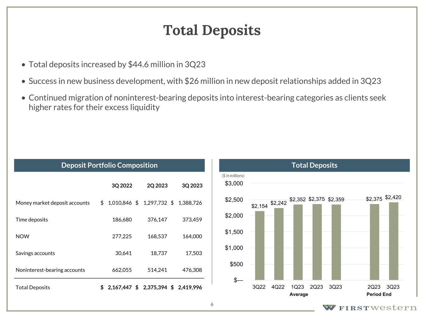 157 180 196 164 166 168 62 94 111 154 161 132 122 125 129 76 78 86 255 255 255 Chart color Table color Special Headlines Slide Headlines / Text on light background Primary Colors Secondary Colors Primary Background / Call Out Boxes / Text on dark background Chart color Table Color Tertiary Colors Chart color Table Color Chart Color Chart Color Approved Fonts AaBbCc 123 Lora (bold) Slide Headlines / Special Headlines AaBbCc 123 Lato (regular, bold, italics) Body Copy / Subheadings / Small Text Descriptions 5 Loan Portfolio • Total loans held for investment increased $34.6 million from prior quarter • Growth driven by commercial and industrial loans, residential mortgage loans, and draws on existing construction lines, partially offset by a decrease in CRE loans due to an increase in payoffs • New loan production of more than $100 million represents largest quarter of new loan production of the year • Average rate on new loan production increased 51 bps to 7.92% compared to prior quarter 3Q 2022 2Q 2023 3Q 2023 Cash, Securities and Other $ 154,748 $ 150,679 $ 148,669 Consumer and Other 27,781 21,866 23,975 Construction and Development 228,060 313,227 349,436 1-4 Family Residential 822,796 878,670 913,085 Non-Owner Occupied CRE 527,836 561,880 527,377 Owner Occupied CRE 220,075 218,651 208,341 Commercial and Industrial 350,954 338,679 349,515 Total $ 2,332,250 $ 2,483,652 $ 2,520,398 Loans accounted for at fair value(2) 22,648 18,274 16,105 Total Loans HFI $ 2,354,898 $ 2,501,926 $ 2,536,503 Loans held-for-sale (HFS) 12,743 19,746 12,105 Total Loans $ 2,367,641 $ 2,521,672 $ 2,548,608 (1) Represents unpaid principal balance. Excludes deferred (fees) costs, and amortized premium/ (unaccreted discount). (2) Excludes fair value adjustments on loans accounted for under the fair value option. ($ in thousands, as of quarter end) Loan Portfolio Composition(1) Loan Portfolio Details Loan Production & Loan Payoffs Total Loans(1) $2,253 $2,445 $2,487 $2,487 2,515 $2,522 $2,549 3Q22 4Q22 1Q23 2Q23 3Q23 2Q23 3Q23 $— $400 $800 $1,200 $1,600 $2,000 $2,400 $2,800 $3,200 Average Period End