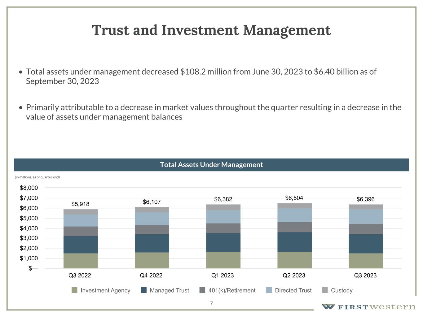 Safe Harbor 2 This presentation contains “forward-looking statements” within the meaning of Section 27A of the Securities Act of 1933, as amended, and Section 21E of the Securities Exchange Act of 1934, as amended. These forward-looking statements reflect the current views of First Western Financial, Inc.’s (“First Western”) management with respect to, among other things, future events and First Western’s financial performance. These statements are often, but not always, made through the use of words or phrases such as “may,” “should,” “could,” “predict,” “potential,” “believe,” “will likely result,” “expect,” “continue,” “will,” “anticipate,” “seek,” “estimate,” “intend,” “plan,” “position,” “project,” “future” “forecast,” “goal,” “target,” “would” and “outlook,” or the negative variations of those words or other comparable words of a future or forward-looking nature. These forward-looking statements are not historical facts, and are based on current expectations, estimates and projections about First Western’s industry, management’s beliefs and certain assumptions made by management, many of which, by their nature, are inherently uncertain and beyond First Western’s control. Accordingly, First Western cautions you that any such forward-looking statements are not guarantees of future performance and are subject to risks, assumptions and uncertainties that are difficult to predict. Although First Western believes that the expectations reflected in these forward-looking statements are reasonable as of the date made, actual results may prove to be materially different from the results expressed or implied by the forward-looking statements. The following risks and uncertainties, among others, could cause actual results and future events to differ materially from those set forth or contemplated in the forward- looking statements: integration risks in connection with acquisitions; the risk of geographic concentration in Colorado, Arizona, Wyoming, California, and Montana; the risk of changes in the economy affecting real estate values and liquidity; the risk in our ability to continue to originate residential real estate loans and sell such loans; risks specific to commercial loans and borrowers; the risk of claims and litigation pertaining to our fiduciary responsibilities; the risk of competition for investment managers and professionals; the risk of fluctuation in the value of our investment securities; the risk of changes in interest rates; and the risk of the adequacy of our allowance for credit losses and the risk in our ability to maintain a strong core deposit base or other low-cost funding sources. Additional information regarding these and other risks and uncertainties to which our business and future financial performance are subject is contained in our Annual Report on Form 10-K filed with the U.S. Securities and Exchange Commission (“SEC”) on March 15, 2023 and other documents we file with the SEC from time to time. All subsequent written and oral forward- looking statements attributable to First Western or persons acting on First Western’s behalf are expressly qualified in their entirety by this paragraph. Forward-looking statements speak only as of the date of this presentation. First Western undertakes no obligation to publicly update or otherwise revise any forward-looking statements, whether as a result of new information, future events or otherwise (except as required by law). Certain of the information contained herein may be derived from information provided by industry sources. The Company believes that such information is accurate and the sources from which it has been obtained are reliable; however, the Company cannot guaranty the accuracy of such information and has not independently verified such information. This presentation contains certain non-GAAP financial measures intended to supplement, not substitute for, comparable GAAP measures. Reconciliations of non-GAAP financial measures to GAAP financial measures are provided at the end of this presentation. Numbers in the presentation may not sum due to rounding. Our common stock is not a deposit or savings account. Our common stock is not insured by the Federal Deposit Insurance Corporation or any governmental agency or instrumentality. This presentation is not an offer to sell any securities and it is not soliciting an offer to buy any securities in any state or jurisdiction where the offer or sale is not permitted. Neither the SEC nor any state securities commission has approved or disapproved of the securities of the Company or passed upon the accuracy or adequacy of this presentation. Any representation to the contrary is a criminal offense. Except as otherwise indicated, this presentation speaks as of the date hereof. The delivery of this presentation shall not, under any circumstances, create any implication that there has been no change in the affairs of the Company after the date hereof.