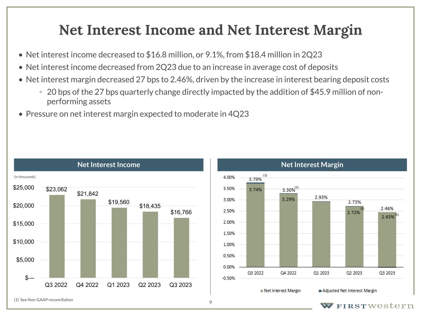 157 180 196 164 166 168 62 94 111 154 161 132 122 125 129 76 78 86 255 255 255 Chart color Table color Special Headlines Slide Headlines / Text on light background Primary Colors Secondary Colors Primary Background / Call Out Boxes / Text on dark background Chart color Table Color Tertiary Colors Chart color Table Color Chart Color Chart Color Approved Fonts AaBbCc 123 Lora (bold) Slide Headlines / Special Headlines AaBbCc 123 Lato (regular, bold, italics) Body Copy / Subheadings / Small Text Descriptions (1) See Non-GAAP reconciliation Gross Revenue 3Q23 Gross Revenue(1) Gross Revenue(1) 8 $29.3 $29.0 $26.1 $24.8 $23.1 Wealth Management Mortgage Q3 2022 Q4 2022 Q1 2023 Q2 2023 Q3 2023 $— $5.0 $10.0 $15.0 $20.0 $25.0 $30.0 $35.0 • Gross revenue(1) declined 6.6% from prior quarter • Decline in net interest income, partially offset by an increase in noninterest income • Non-interest income mix increased to 26.7% from 17.7% in prior quarter