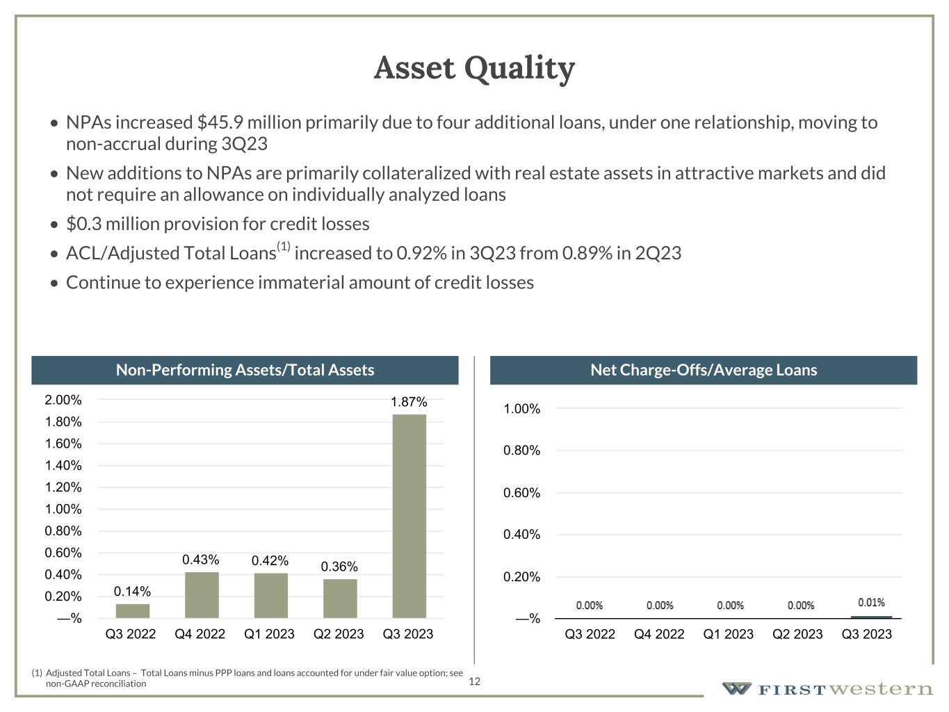 157 180 196 164 166 168 62 94 111 154 161 132 122 125 129 76 78 86 255 255 255 Chart color Table color Special Headlines Slide Headlines / Text on light background Primary Colors Secondary Colors Primary Background / Call Out Boxes / Text on dark background Chart color Table Color Tertiary Colors Chart color Table Color Chart Color Chart Color Approved Fonts AaBbCc 123 Lora (bold) Slide Headlines / Special Headlines AaBbCc 123 Lato (regular, bold, italics) Body Copy / Subheadings / Small Text Descriptions 11 Non-Interest Expense and Efficiency Ratio • Non-interest expense decreased 1.1% from 2Q23 • Disciplined expense management resulted in non-interest expense coming in at low end of targeted range • Non-interest expense expected within the range of $18.5 million to $19.0 million for the remainder of 2023 (1) (1) See Non-GAAP reconciliation Total Non-Interest Expense Operating Efficiency Ratio(1) (in thousands) (1) (1) (1) (1) $19,260 $19,905 $20,528 $18,519 $18,314 $231 $272 $101 $76 $92 Non-Interest Expense Adjustments to Non-Interest Expense Q3 2022 Q4 2022 Q1 2023 Q2 2023 Q3 2023 $— $5,000 $10,000 $15,000 $20,000 $25,000 64.94% 67.66% 78.29% 74.42% 78.76% Q3 2022 Q4 2022 Q1 2023 Q2 2023 Q3 2023 —% 20.00% 40.00% 60.00% 80.00% 100.00% (1) (1) (1) (1) (1)