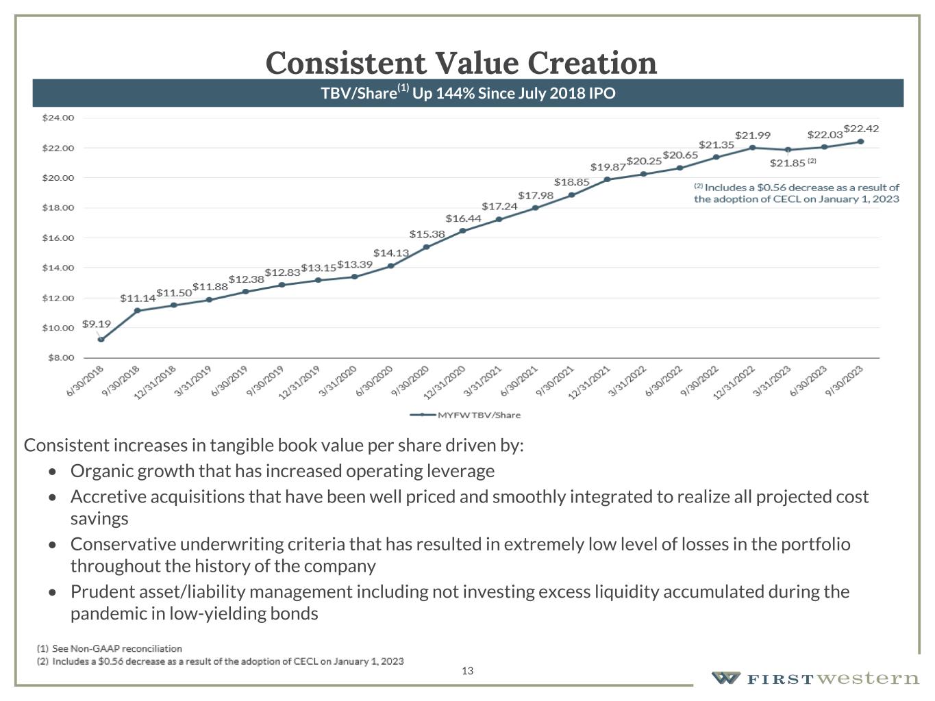 157 180 196 164 166 168 62 94 111 154 161 132 122 125 129 76 78 86 255 255 255 Chart color Table color Special Headlines Slide Headlines / Text on light background Primary Colors Secondary Colors Primary Background / Call Out Boxes / Text on dark background Chart color Table Color Tertiary Colors Chart color Table Color Chart Color Chart Color Approved Fonts AaBbCc 123 Lora (bold) Slide Headlines / Special Headlines AaBbCc 123 Lato (regular, bold, italics) Body Copy / Subheadings / Small Text Descriptions 12 Asset Quality • NPAs increased $45.9 million primarily due to four additional loans, under one relationship, moving to non-accrual during 3Q23 • New additions to NPAs are primarily collateralized with real estate assets in attractive markets and did not require an allowance on individually analyzed loans • $0.3 million provision for credit losses • ACL/Adjusted Total Loans(1) increased to 0.92% in 3Q23 from 0.89% in 2Q23 • Continue to experience immaterial amount of credit losses Non-Performing Assets/Total Assets Net Charge-Offs/Average Loans (1) Adjusted Total Loans – Total Loans minus PPP loans and loans accounted for under fair value option; see non-GAAP reconciliation 0.14% 0.43% 0.42% 0.36% 1.87% Q3 2022 Q4 2022 Q1 2023 Q2 2023 Q3 2023 —% 0.20% 0.40% 0.60% 0.80% 1.00% 1.20% 1.40% 1.60% 1.80% 2.00% Q3 2022 Q4 2022 Q1 2023 Q2 2023 Q3 2023 —% 0.20% 0.40% 0.60% 0.80% 1.00%