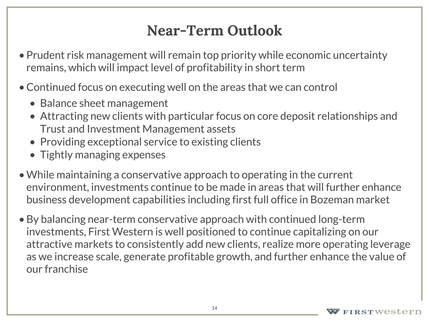 157 180 196 164 166 168 62 94 111 154 161 132 122 125 129 76 78 86 255 255 255 Chart color Table color Special Headlines Slide Headlines / Text on light background Primary Colors Secondary Colors Primary Background / Call Out Boxes / Text on dark background Chart color Table Color Tertiary Colors Chart color Table Color Chart Color Chart Color Approved Fonts AaBbCc 123 Lora (bold) Slide Headlines / Special Headlines AaBbCc 123 Lato(regular, bold, italics) Body Copy / Subheadings / Small Text Descriptions 14 Near-Term Outlook • Prudent risk management will remain top priority while economic uncertainty remains, which will impact level of profitability in short term • Continued focus on executing well on the areas that we can control • Balance sheet management • Attracting new clients with particular focus on core deposit relationships and Trust and Investment Management assets • Providing exceptional service to existing clients • Tightly managing expenses • While maintaining a conservative approach to operating in the current environment, investments continue to be made in areas that will further enhance business development capabilities including first full office in Bozeman market • By balancing near-term conservative approach with continued long-term investments, First Western is well positioned to continue capitalizing on our attractive markets to consistently add new clients, realize more operating leverage as we increase scale, generate profitable growth, and further enhance the value of our franchise