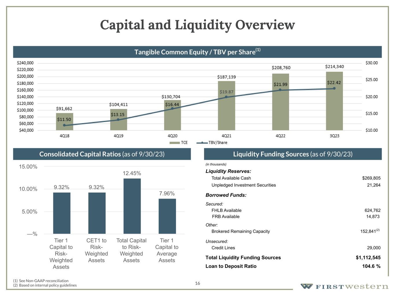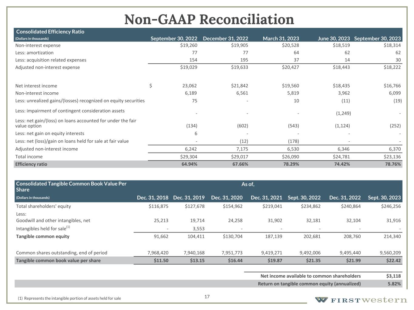 157 180 196 164 166 168 62 94 111 154 161 132 122 125 129 76 78 86 255 255 255 Chart color Table color Special Headlines Slide Headlines / Text on light background Primary Colors Secondary Colors Primary Background / Call Out Boxes / Text on dark background Chart color Table Color Tertiary Colors Chart color Table Color Chart Color Chart Color Approved Fonts AaBbCc 123 Lora (bold) Slide Headlines / Special Headlines AaBbCc 123 Lato (regular, bold, italics) Body Copy / Subheadings / Small Text Descriptions 17 Non-GAAP Reconciliation Consolidated Tangible Common Book Value Per Share As of, (Dollars in thousands) Dec. 31, 2018 Dec. 31, 2019 Dec. 31, 2020 Dec. 31, 2021 Sept. 30, 2022 Dec. 31, 2022 Sept. 30, 2023 Total shareholders' equity $116,875 $127,678 $154,962 $219,041 $234,862 $240,864 $246,256 Less: Goodwill and other intangibles, net 25,213 19,714 24,258 31,902 32,181 32,104 31,916 Intangibles held for sale(1) - 3,553 - - - - - Tangible common equity 91,662 104,411 $130,704 187,139 202,681 208,760 214,340 Common shares outstanding, end of period 7,968,420 7,940,168 7,951,773 9,419,271 9,492,006 9,495,440 9,560,209 Tangible common book value per share $11.50 $13.15 $16.44 $19.87 $21.35 $21.99 $22.42 Net income available to common shareholders $3,118 Return on tangible common equity (annualized) 5.82% (1) Represents the intangible portion of assets held for sale  Consolidated Efficiency Ratio (Dollars in thousands) September 30, 2022 December 31, 2022 March 31, 2023 June 30, 2023 September 30, 2023 Non-interest expense $19,260 $19,905 $20,528 $18,519 $18,314 Less: amortization 77 77 64 62 62 Less: acquisition related expenses 154 195 37 14 30 Adjusted non-interest expense $19,029 $19,633 $20,427 $18,443 $18,222 Net interest income $ 23,062 $21,842 $19,560 $18,435 $16,766 Non-interest income 6,189 6,561 5,819 3,962 6,099 Less: unrealized gains/(losses) recognized on equity securities 75 - 10 (11) (19) Less: impairment of contingent consideration assets - - - (1,249) - Less: net gain/(loss) on loans accounted for under the fair value option (134) (602) (543) (1,124) (252) Less: net gain on equity interests 6 - - - - Less: net (loss)/gain on loans held for sale at fair value - (12) (178) - - Adjusted non-interest income 6,242 7,175 6,530 6,346 6,370 Total income $29,304 $29,017 $26,090 $24,781 $23,136 Efficiency ratio 64.94% 67.66% 78.29% 74.42% 78.76%