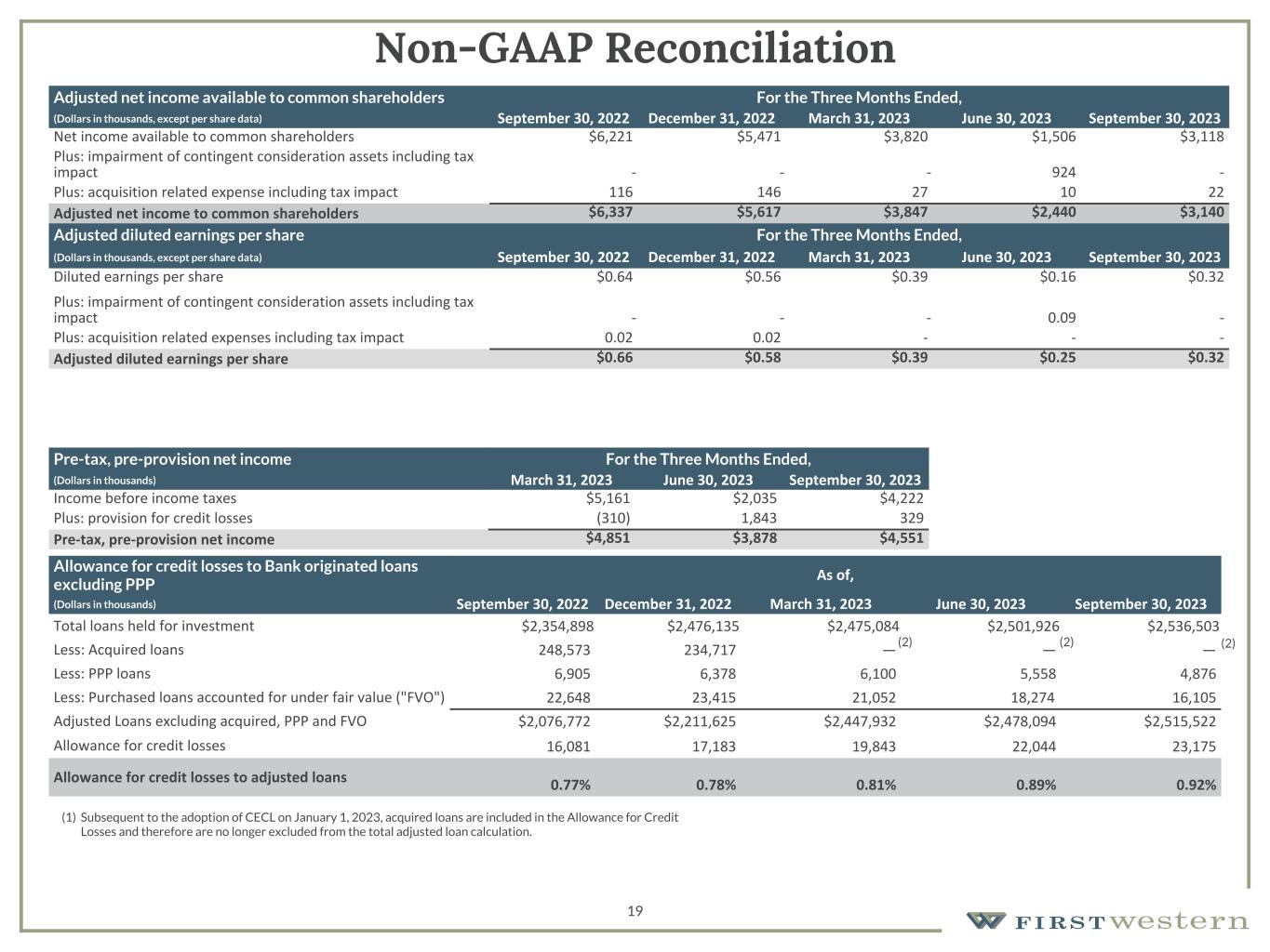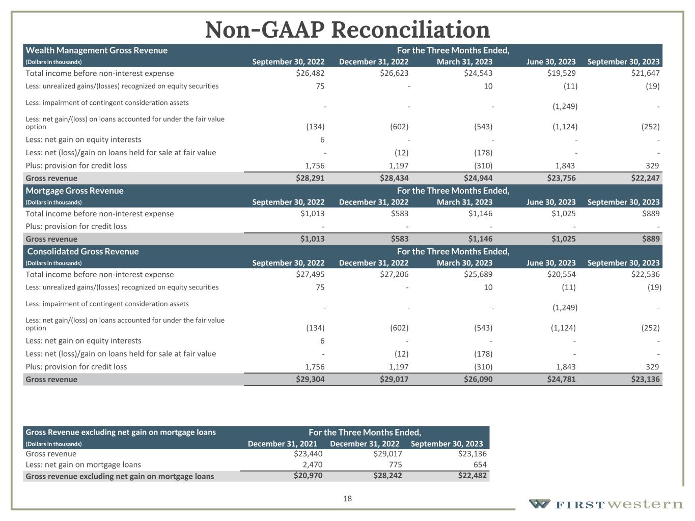 157 180 196 164 166 168 62 94 111 154 161 132 122 125 129 76 78 86 255 255 255 Chart color Table color Special Headlines Slide Headlines / Text on light background Primary Colors Secondary Colors Primary Background / Call Out Boxes / Text on dark background Chart color Table Color Tertiary Colors Chart color Table Color Chart Color Chart Color Approved Fonts AaBbCc 123 Lora (bold) Slide Headlines / Special Headlines AaBbCc 123 Lato (regular, bold, italics) Body Copy / Subheadings / Small Text Descriptions 18 Non-GAAP Reconciliation Wealth Management Gross Revenue For the Three Months Ended, (Dollars in thousands) September 30, 2022 December 31, 2022 March 31, 2023 June 30, 2023 September 30, 2023 Total income before non-interest expense $26,482 $26,623 $24,543 $19,529 $21,647 Less: unrealized gains/(losses) recognized on equity securities 75 - 10 (11) (19) Less: impairment of contingent consideration assets - - - (1,249) - Less: net gain/(loss) on loans accounted for under the fair value option (134) (602) (543) (1,124) (252) Less: net gain on equity interests 6 - - - - Less: net (loss)/gain on loans held for sale at fair value - (12) (178) - - Plus: provision for credit loss 1,756 1,197 (310) 1,843 329 Gross revenue $28,291 $28,434 $24,944 $23,756 $22,247 Mortgage Gross Revenue For the Three Months Ended, (Dollars in thousands) September 30, 2022 December 31, 2022 March 31, 2023 June 30, 2023 September 30, 2023 Total income before non-interest expense $1,013 $583 $1,146 $1,025 $889 Plus: provision for credit loss - - - - - Gross revenue $1,013 $583 $1,146 $1,025 $889  Consolidated Gross Revenue For the Three Months Ended, (Dollars in thousands) September 30, 2022 December 31, 2022 March 30, 2023 June 30, 2023 September 30, 2023 Total income before non-interest expense $27,495 $27,206 $25,689 $20,554 $22,536 Less: unrealized gains/(losses) recognized on equity securities 75 - 10 (11) (19) Less: impairment of contingent consideration assets - - - (1,249) - Less: net gain/(loss) on loans accounted for under the fair value option (134) (602) (543) (1,124) (252) Less: net gain on equity interests 6 - - - - Less: net (loss)/gain on loans held for sale at fair value - (12) (178) - - Plus: provision for credit loss 1,756 1,197 (310) 1,843 329 Gross revenue $29,304 $29,017 $26,090 $24,781 $23,136 Gross Revenue excluding net gain on mortgage loans For the Three Months Ended, (Dollars in thousands) December 31, 2021 December 31, 2022 September 30, 2023 Gross revenue $23,440 $29,017 $23,136 Less: net gain on mortgage loans 2,470 775 654 Gross revenue excluding net gain on mortgage loans $20,970 $28,242 $22,482