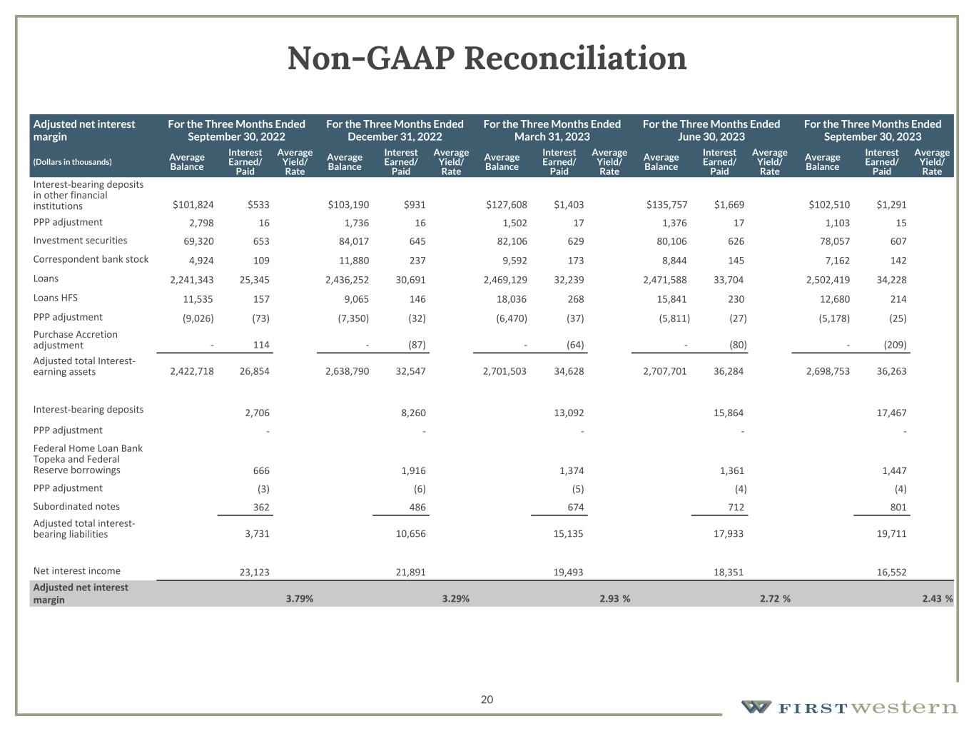 157 180 196 164 166 168 62 94 111 154 161 132 122 125 129 76 78 86 255 255 255 Chart color Table color Special Headlines Slide Headlines / Text on light background Primary Colors Secondary Colors Primary Background / Call Out Boxes / Text on dark background Chart color Table Color Tertiary Colors Chart color Table Color Chart Color Chart Color Approved Fonts AaBbCc 123 Lora (bold) Slide Headlines / Special Headlines AaBbCc 123 Lato (regular, bold, italics) Body Copy / Subheadings / Small Text Descriptions 20 Non-GAAP Reconciliation Adjusted net interest margin For the Three Months Ended September 30, 2022 For the Three Months Ended December 31, 2022 For the Three Months Ended March 31, 2023 For the Three Months Ended June 30, 2023 For the Three Months Ended September 30, 2023 (Dollars in thousands) Average Balance Interest Earned/ Paid Average Yield/ Rate Average Balance Interest Earned/ Paid Average Yield/ Rate Average Balance Interest Earned/ Paid Average Yield/ Rate Average Balance Interest Earned/ Paid Average Yield/ Rate Average Balance Interest Earned/ Paid Average Yield/ Rate Interest-bearing deposits in other financial institutions $101,824 $533 $103,190 $931 $127,608 $1,403 $135,757 $1,669 $102,510 $1,291 PPP adjustment 2,798 16 1,736 16 1,502 17 1,376 17 1,103 15 Investment securities 69,320 653 84,017 645 82,106 629 80,106 626 78,057 607 Correspondent bank stock 4,924 109 11,880 237 9,592 173 8,844 145 7,162 142 Loans 2,241,343 25,345 2,436,252 30,691 2,469,129 32,239 2,471,588 33,704 2,502,419 34,228 Loans HFS 11,535 157 9,065 146 18,036 268 15,841 230 12,680 214 PPP adjustment (9,026) (73) (7,350) (32) (6,470) (37) (5,811) (27) (5,178) (25) Purchase Accretion adjustment - 114 - (87) - (64) - (80) - (209) Adjusted total Interest- earning assets 2,422,718 26,854 2,638,790 32,547 2,701,503 34,628 2,707,701 36,284 2,698,753 36,263 Interest-bearing deposits 2,706 8,260 13,092 15,864 17,467 PPP adjustment - - - - - Federal Home Loan Bank Topeka and Federal Reserve borrowings 666 1,916 1,374 1,361 1,447 PPP adjustment (3) (6) (5) (4) (4) Subordinated notes 362 486 674 712 801 Adjusted total interest- bearing liabilities 3,731 10,656 15,135 17,933 19,711 Net interest income 23,123 21,891 19,493 18,351 16,552 Adjusted net interest margin 3.79% 3.29% 2.93 % 2.72 % 2.43 %