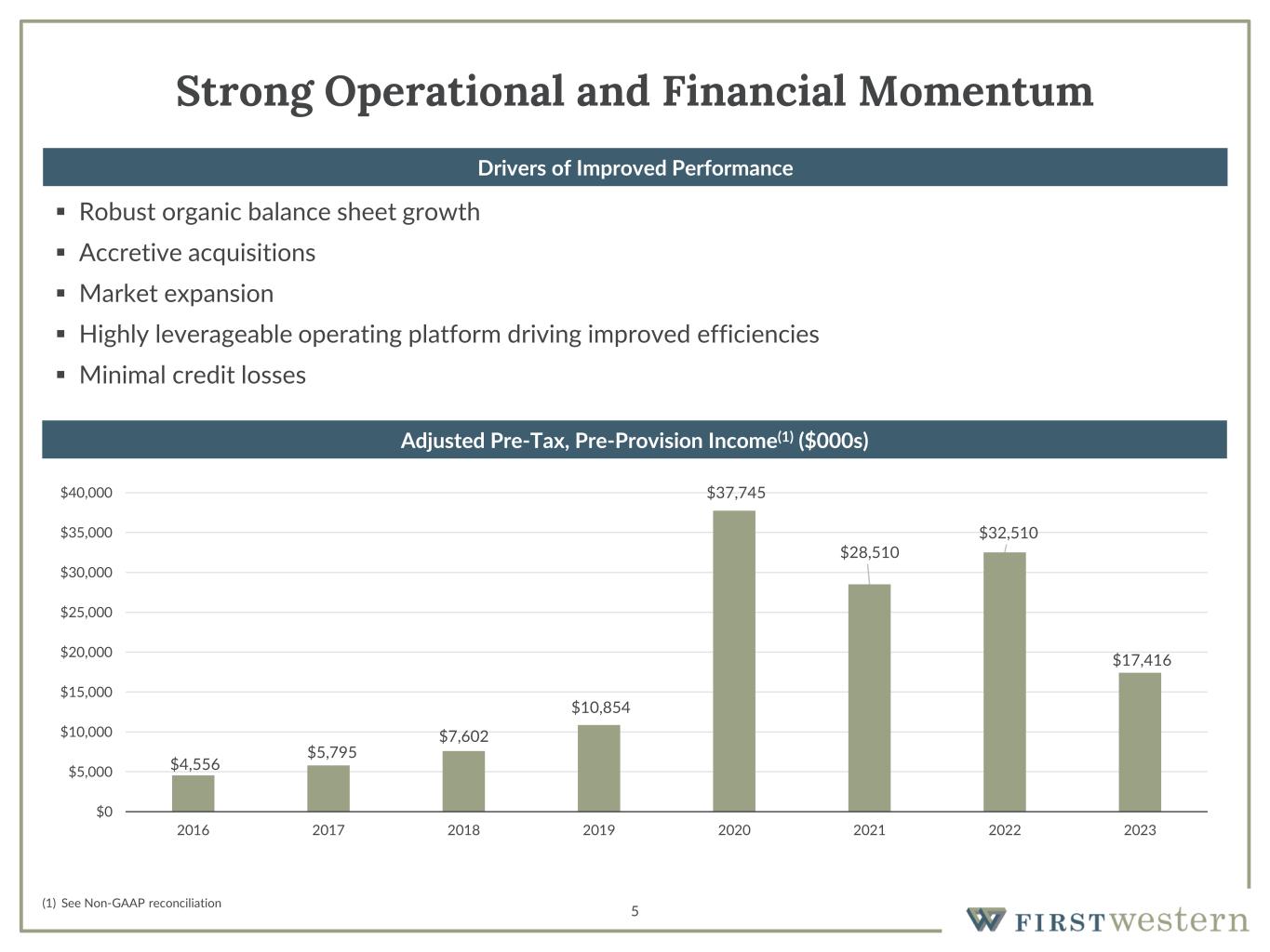 4 Investment Highlights Successful Execution on Growth Strategies Attractive Markets and Business Model Strong Earnings Momentum ▪ Significant revenue growth driving improved operating leverage and higher profitability since pre-IPO ▪ TBV/share(1) increased ~140% since the IPO, 21% in 2021, 11% in 2022 and 0.1% in 2023. ▪ Continued scale expected to drive further leverage and generate returns consistent with a high performing institution over long term ▪ Chairman and CEO has previously built and sold three banks for substantial gains for shareholders ▪ COO has been instrumental in building the MYFW franchise over 17 years at the institution ▪ Highly aligned with shareholder interests as insiders own ~18% of total shares outstanding(2) ▪ Discounted valuation trading at just 0.79x TBV/share(3) Proven Management Team, High Insider Ownership, and Discounted Valuation ▪ Track record of combining organic growth and market expansion with accretive acquisitions to enhance franchise value ▪ Total assets up 184% since the IPO, 28% in 2021, 13% in 2022 and 4% in 2023 with substantial increases in revenue and EPS ▪ Strengthening commercial banking platform creating more diverse loan portfolio and lower-cost deposit base ▪ Rapidly growing institution operating in high growth markets ▪ Attractive, stable deposit base with noninterest-bearing and money market accounts comprising 77% of total deposits as of 3/31/24 ▪ Conservative underwriting and affluent client base results in minimal credit losses (1) See Non-GAAP reconciliation (2) Represents beneficial ownership as defined by the Proxy Statement (3) As of April 3, 2024