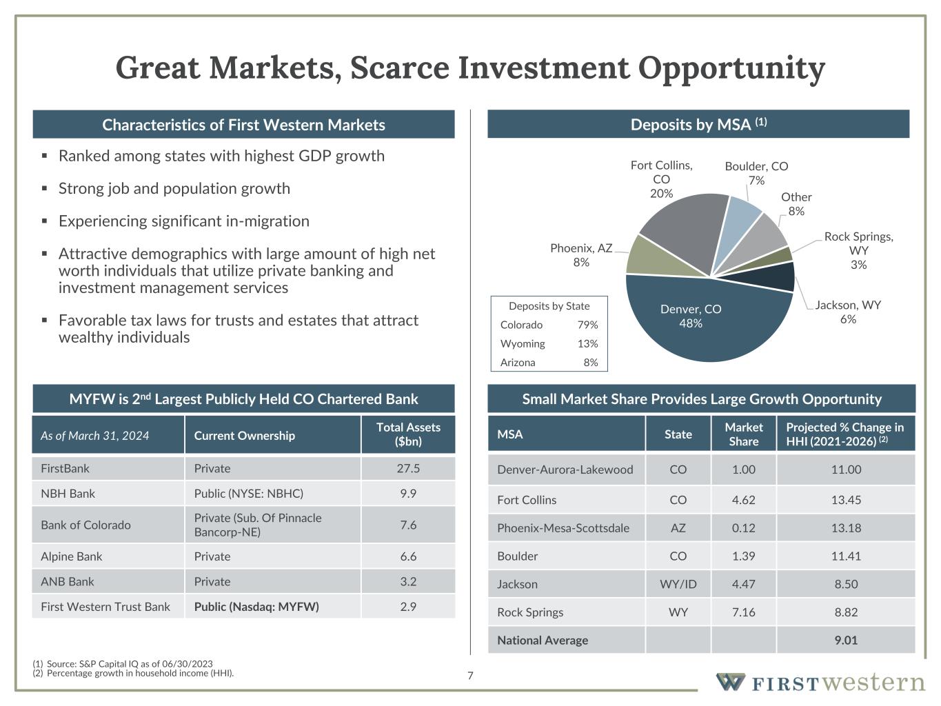 Safe Harbor 2 This presentation contains “forward-looking statements” within the meaning of Section 27A of the Securities Act of 1933, as amended, and Section 21E of the Securities Exchange Act of 1934, as amended. These forward-looking statements reflect the current views of First Western Financial, Inc.’s (“First Western”) management with respect to, among other things, future events and First Western’s financial performance. These statements are often, but not always, made through the use of words or phrases such as “may,” “should,” “could,” “predict,” “potential,” “believe,” “will likely result,” “expect,” “continue,” “will,” “anticipate,” “seek,” “estimate,” “intend,” “plan,” “position,” “project,” “future” “forecast,” “goal,” “target,” “would” and “outlook,” or the negative variations of those words or other comparable words of a future or forward-looking nature. These forward-looking statements are not historical facts, and are based on current expectations, estimates and projections about First Western’s industry, management’s beliefs and certain assumptions made by management, many of which, by their nature, are inherently uncertain and beyond First Western’s control. Accordingly, First Western cautions you that any such forward-looking statements are not guarantees of future performance and are subject to risks, assumptions and uncertainties that are difficult to predict. Although First Western believes that the expectations reflected in these forward-looking statements are reasonable as of the date made, actual results may prove to be materially different from the results expressed or implied by the forward-looking statements. The following risks and uncertainties, among others, could cause actual results and future events to differ materially from those set forth or contemplated in the forward-looking statements: integration risks in connection with acquisitions; the risk of geographic concentration in Colorado, Arizona, Wyoming, California, and Montana; the risk of changes in the economy affecting real estate values and liquidity; the risk in our ability to continue to originate residential real estate loans and sell such loans; risks specific to commercial loans and borrowers; the risk of claims and litigation pertaining to our fiduciary responsibilities; the risk of competition for investment managers and professionals; the risk of fluctuation in the value of our investment securities; the risk of changes in interest rates; and the risk of the adequacy of our allowance for credit losses and the risk in our ability to maintain a strong core deposit base or other low-cost funding sources. Additional information regarding these and other risks and uncertainties to which our business and future financial performance are subject is contained in our Annual Report on Form 10-K filed with the U.S. Securities and Exchange Commission (“SEC”) on March 15, 2023 and other documents we file with the SEC from time to time. All subsequent written and oral forward-looking statements attributable to First Western or persons acting on First Western’s behalf are expressly qualified in their entirety by this paragraph. Forward-looking statements speak only as of the date of this presentation. First Western undertakes no obligation to publicly update or otherwise revise any forward-looking statements, whether as a result of new information, future events or otherwise (except as required by law). Certain of the information contained herein may be derived from information provided by industry sources. The Company believes that such information is accurate and the sources from which it has been obtained are reliable; however, the Company cannot guaranty the accuracy of such information and has not independently verified such information. This presentation contains certain non-GAAP financial measures intended to supplement, not substitute for, comparable GAAP measures. Reconciliations of non-GAAP financial measures to GAAP financial measures are provided at the end of this presentation. Numbers in the presentation may not sum due to rounding. Our common stock is not a deposit or savings account. Our common stock is not insured by the Federal Deposit Insurance Corporation or any governmental agency or instrumentality. This presentation is not an offer to sell any securities and it is not soliciting an offer to buy any securities in any state or jurisdiction where the offer or sale is not permitted. Neither the SEC nor any state securities commission has approved or disapproved of the securities of the Company or passed upon the accuracy or adequacy of this presentation. Any representation to the contrary is a criminal offense. Except as otherwise indicated, this presentation speaks as of the date hereof. The delivery of this presentation shall not, under any circumstances, create any implication that there has been no change in the affairs of the Company after the date hereof.