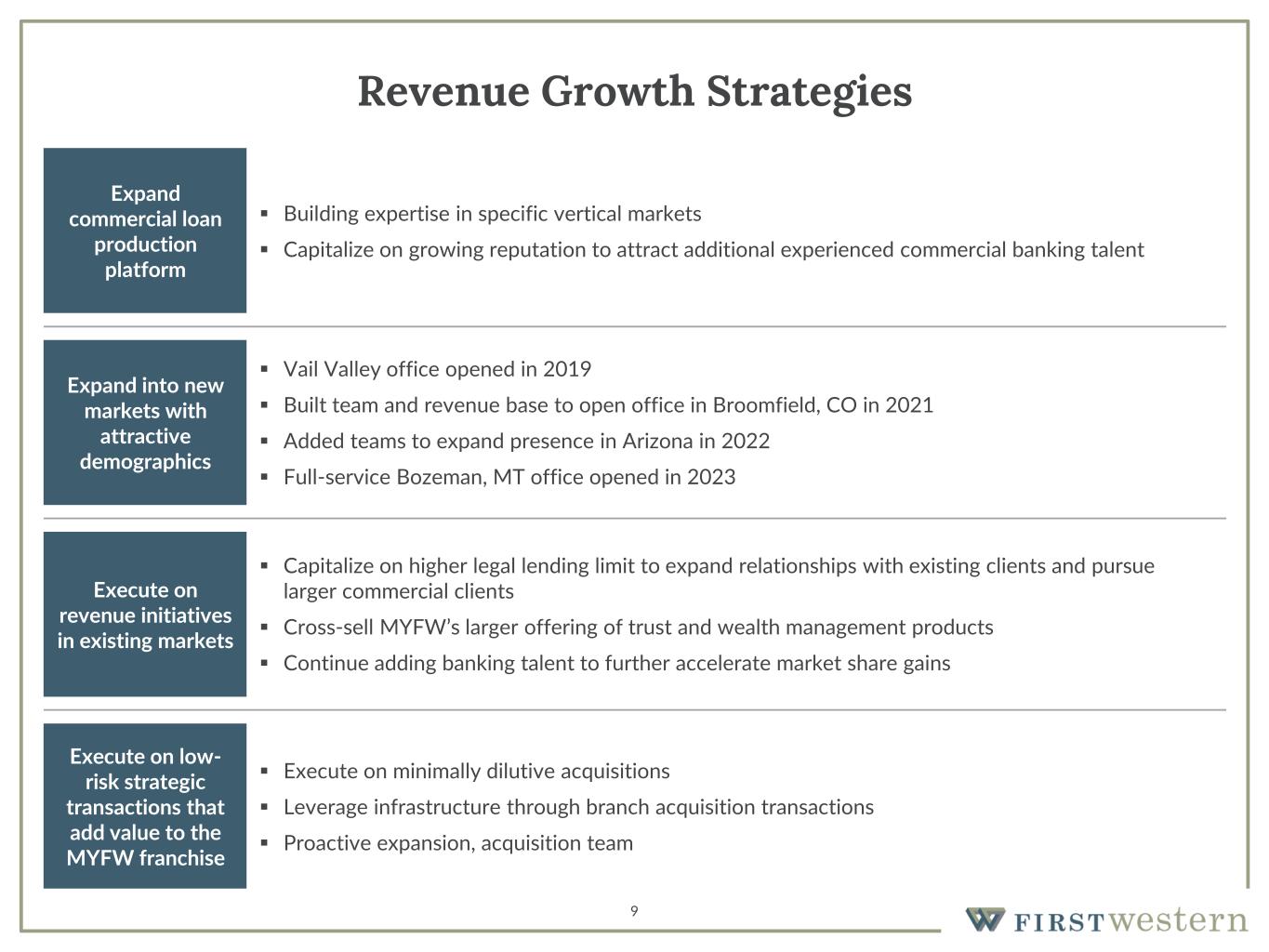 8 Success in Expansion and Acquisition Growth 2006 – 2010 (3) ▪ Boulder, CO ▪ Century City, CA ▪ Scottsdale, AZ 2011 – 2015 (6) ▪ Aspen, CO ▪ DTC/Cherry Hills, CO ▪ Fort Collins, CO ▪ Jackson Hole, WY ▪ Laramie, WY(4) ▪ Phoenix, AZ 2016 – 2020 (4) ▪ Broomfield, CO (2021) ▪ Greenwood Village, CO ▪ Lone Tree, CO(2) ▪ Vail Valley, CO 2002 – 2005 (3) ▪ Cherry Creek, CO ▪ Denver, CO ▪ Northern Colorado, CO 2002 – 2005 (5) ▪ Westcor Insurance Group, Inc. ▪ Poudre River Valley Trust Co. ▪ Sprout & Associates, Inc. ▪ Sterling Partners ▪ Silversmith Financial Corp 2006 – 2010 (4) ▪ Reber/Russell Company ▪ Ryder, Stilwell Inc. ▪ Asset Purchase – Financial Management Advisors, LLC ▪ Asset Purchase – GKM Advisors, LLC 2011 – 2015 (1) ▪ Trust Department Assets – First National Bank of Wyoming 2016 – 2020 (2) ▪ Asset Purchase – EMC Holdings, Inc. ▪ Branch Purchase & Assumption from Simmons Bank O ff ic e O pe ni ng s A cq ui si ti on s 2002 2024 3 5 6 9 12 10 16 12 # #Total Acquisitions Total Offices 18 13 2021 - 2022 (1) ▪ Teton Financial Services, Inc. 2021 - 2022 (5) ▪ Jackson Hole, WY(1) ▪ Pinedale, WY(1) ▪ Rock Springs, WY(1) ▪ Bozeman, MT(5) ▪ Phoenix, AZ(3) (1) Added through the Teton Financial Services, Inc. acquisition. Jackson Hole offices were consolidated in May 2022 (2) Lone Tree office closed in 2Q2022 (3) Phoenix loan production office opened in 4Q2022 (4) Laramie trust office closed 1Q2023 (5) Bozeman office expanded from a loan production office to a full-service office in 3Q23