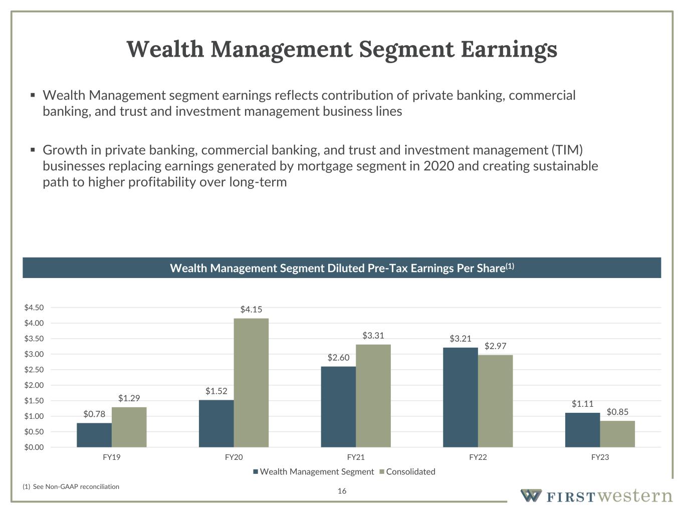 15 Private Bank Model Generates Strong Fee Income 5-Year Average: More than 38% of Operating Revenue Generated by Fee Income 58.5% 38.8% 36.9% 34.5% 32.0% 28.1% 26.1% 27.5% 25.3% 26.0% 18.6% 0.0% 10.0% 20.0% 30.0% 40.0% 50.0% 60.0% 70.0% ALRS MYFW UMBF WASH PGC UVSP CATC SYBT CFR TMP FFWM Noninterest Income/Operating Revenue Peer Average Source: S&P Capital IQ (2019-2023)