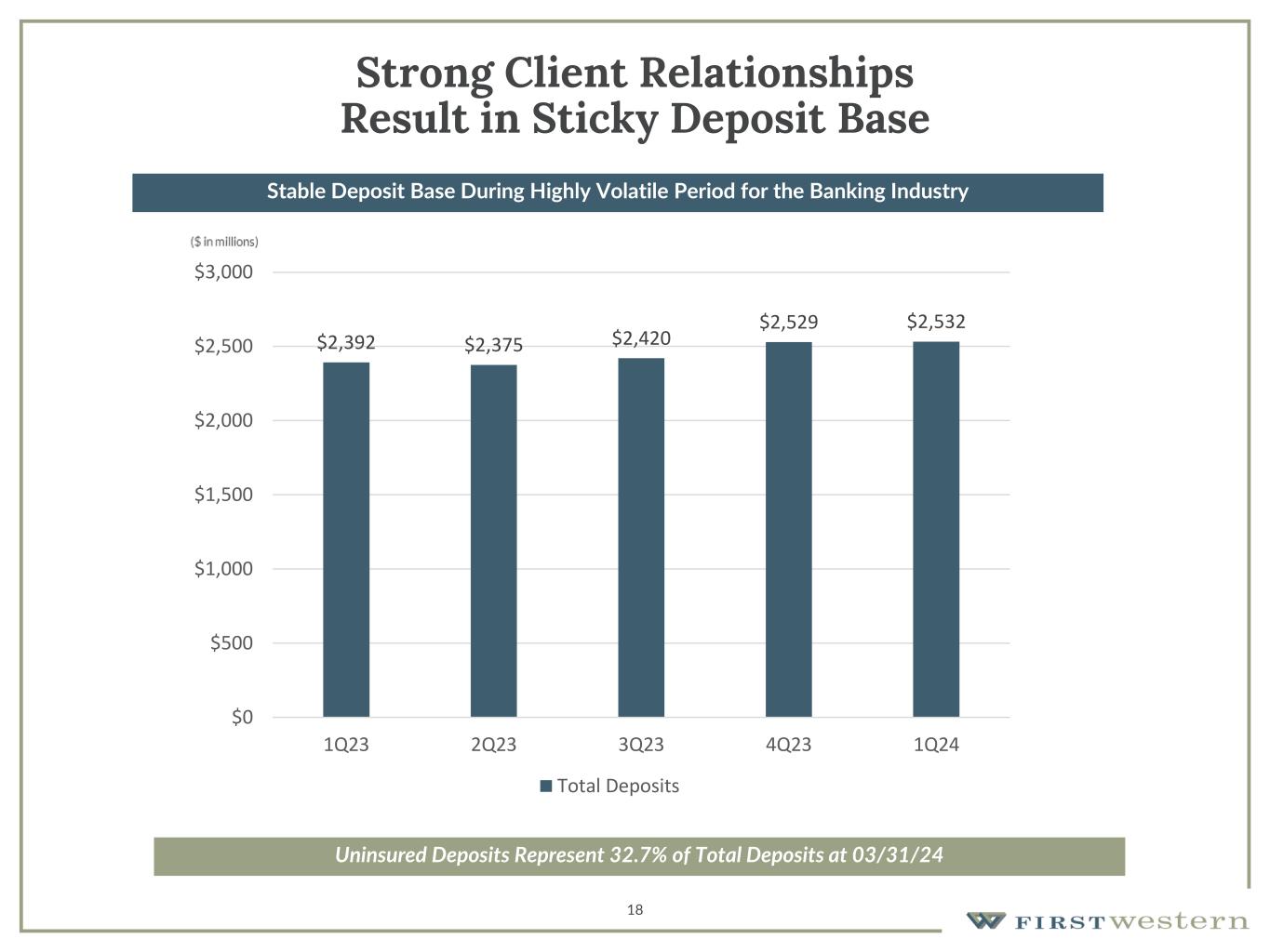 17 Long Track Record of Superior Credit Quality • Relationship-based approach, conservative underwriting criteria, and financial strength of clients have resulted in minimal credit losses over First Western’s history ➢ Underwriting criteria includes three sources of repayment including personal guarantees ➢ Low LTVs and high DSCRs ➢ 66% of borrowers have deposit accounts at First Western 0.0% 0.5% 1.0% 1.5% 2.0% 2009 2010 2011 2012 2013 2014 2015 2016 2017 2018 2019 2020 2021 2022 2023 Net Charge-offs as a Percent to Average Loans