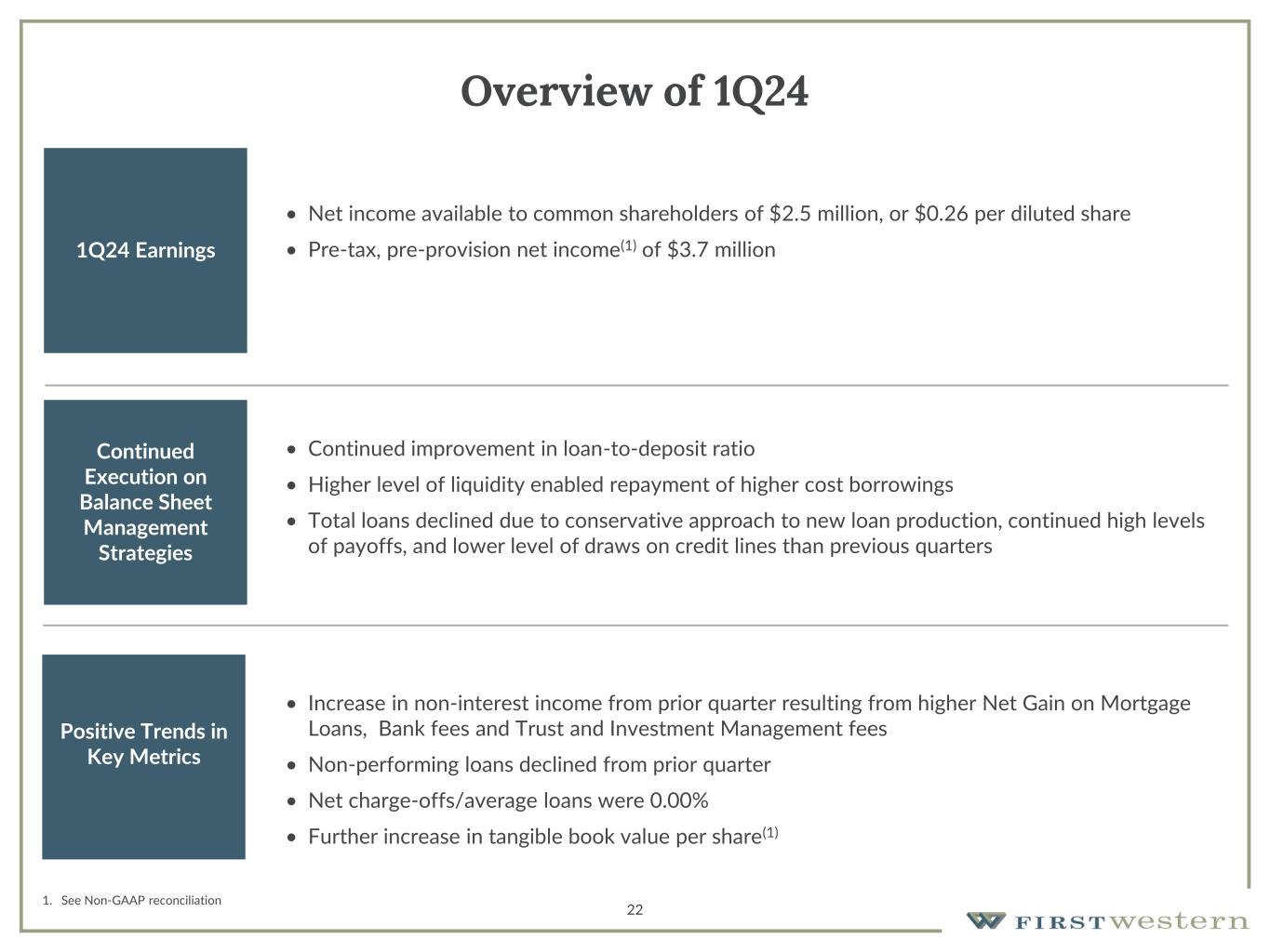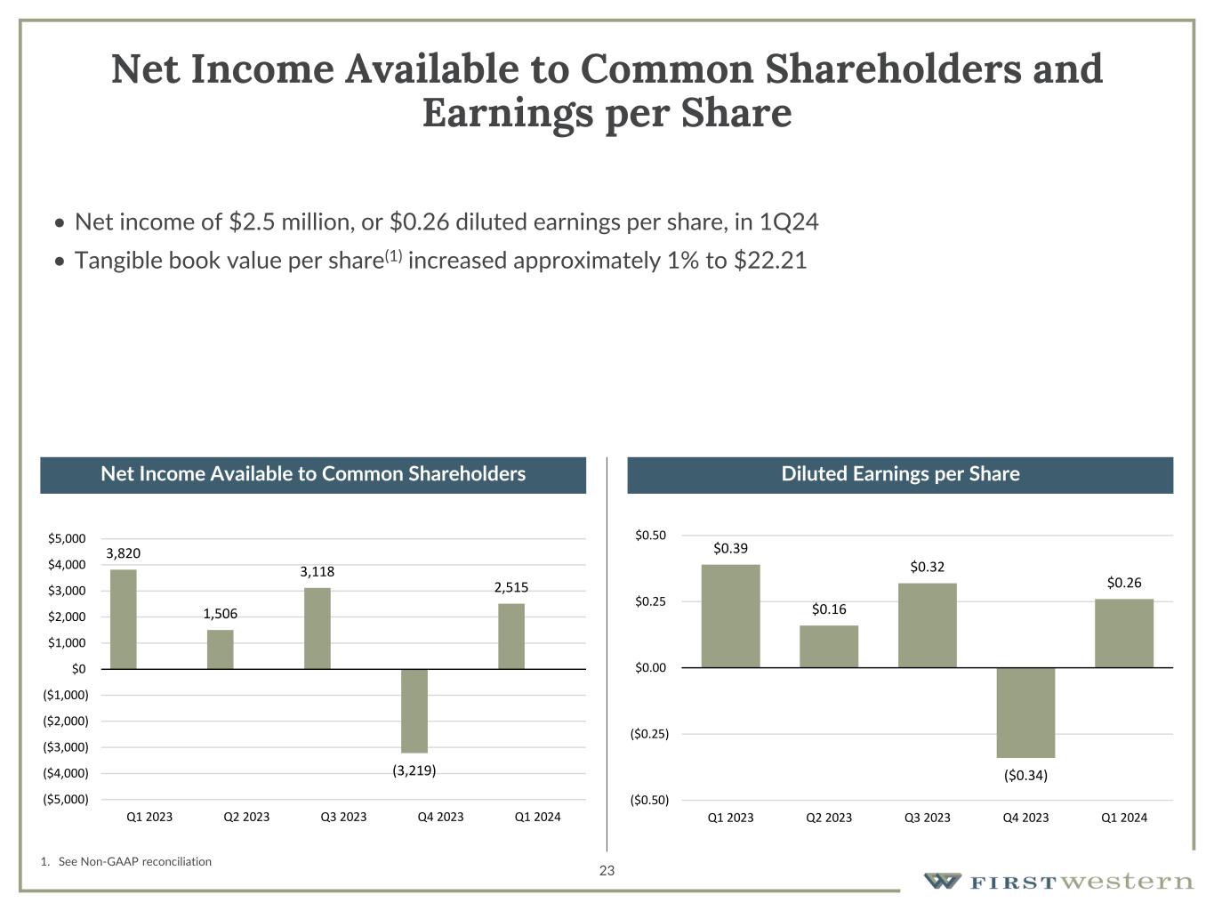 Overview of 1Q24 1Q24 Earnings • Net income available to common shareholders of $2.5 million, or $0.26 per diluted share • Pre-tax, pre-provision net income(1) of $3.7 million Continued Execution on Balance Sheet Management Strategies • Continued improvement in loan-to-deposit ratio • Higher level of liquidity enabled repayment of higher cost borrowings • Total loans declined due to conservative approach to new loan production, continued high levels of payoffs, and lower level of draws on credit lines than previous quarters Positive Trends in Key Metrics • Increase in non-interest income from prior quarter resulting from higher Net Gain on Mortgage Loans, Bank fees and Trust and Investment Management fees • Non-performing loans declined from prior quarter • Net charge-offs/average loans were 0.00% • Further increase in tangible book value per share(1) 1. See Non-GAAP reconciliation 22