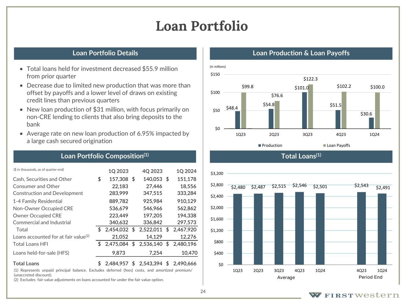 $0.39 $0.16 $0.32 ($0.34) $0.26 ($0.50) ($0.25) $0.00 $0.25 $0.50 Q1 2023 Q2 2023 Q3 2023 Q4 2023 Q1 2024 3,820 1,506 3,118 (3,219) 2,515 ($5,000) ($4,000) ($3,000) ($2,000) ($1,000) $0 $1,000 $2,000 $3,000 $4,000 $5,000 Q1 2023 Q2 2023 Q3 2023 Q4 2023 Q1 2024 23 Net Income Available to Common Shareholders and Earnings per Share • Net income of $2.5 million, or $0.26 diluted earnings per share, in 1Q24 • Tangible book value per share(1) increased approximately 1% to $22.21 Net Income Available to Common Shareholders Diluted Earnings per Share 1. See Non-GAAP reconciliation