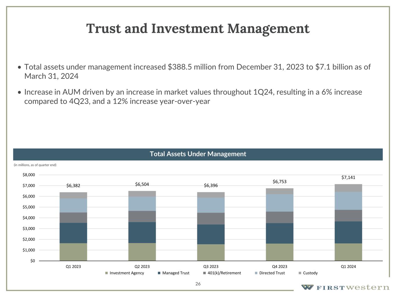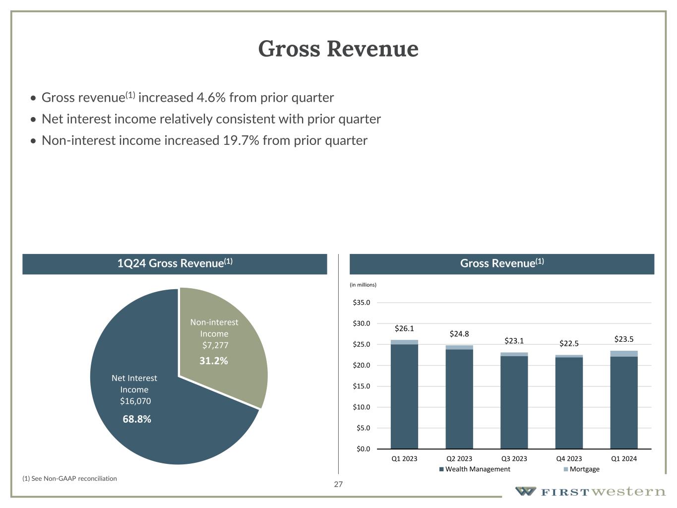 26 Trust and Investment Management • Total assets under management increased $388.5 million from December 31, 2023 to $7.1 billion as of March 31, 2024 • Increase in AUM driven by an increase in market values throughout 1Q24, resulting in a 6% increase compared to 4Q23, and a 12% increase year-over-year (in millions, as of quarter end) Total Assets Under Management $6,382 $6,504 $6,396 $6,753 $7,141 $0 $1,000 $2,000 $3,000 $4,000 $5,000 $6,000 $7,000 $8,000 Q1 2023 Q2 2023 Q3 2023 Q4 2023 Q1 2024 Investment Agency Managed Trust 401(k)/Retirement Directed Trust Custody