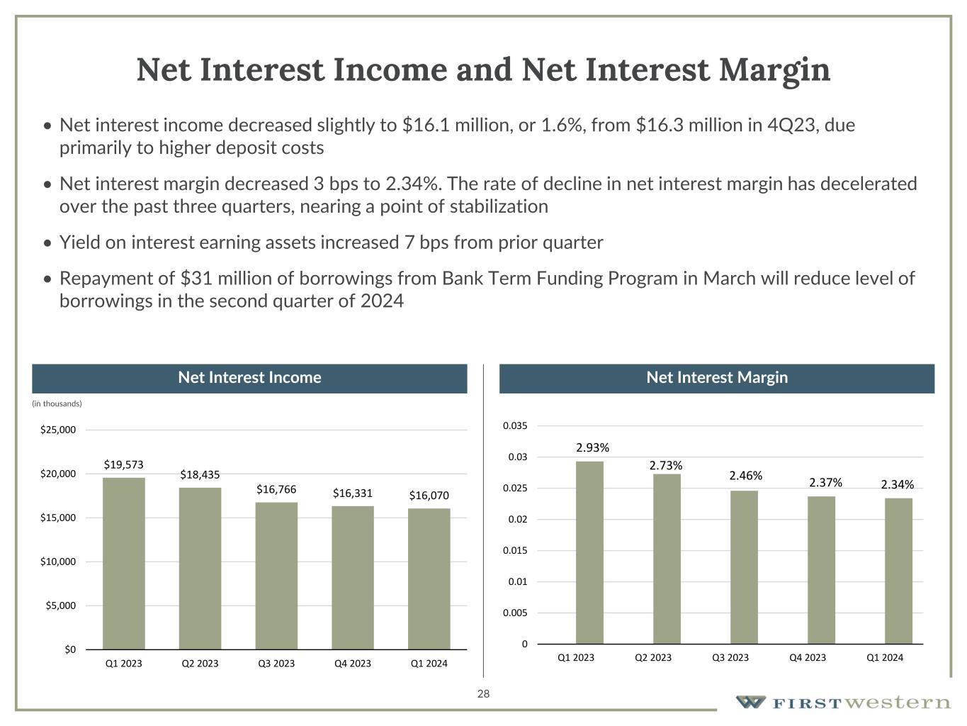 (1) See Non-GAAP reconciliation Gross Revenue 1Q24 Gross Revenue(1) Gross Revenue(1) 27 • Gross revenue(1) increased 4.6% from prior quarter • Net interest income relatively consistent with prior quarter • Non-interest income increased 19.7% from prior quarter Non-interest Income $7,277 Net Interest Income $16,070 31.2% 68.8% $26.1 $24.8 $23.1 $22.5 $23.5 $0.0 $5.0 $10.0 $15.0 $20.0 $25.0 $30.0 $35.0 Q1 2023 Q2 2023 Q3 2023 Q4 2023 Q1 2024 Wealth Management Mortgage (in millions)