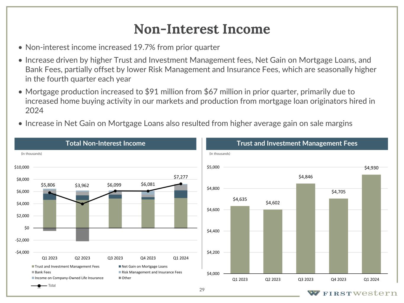 28 Net Interest Income and Net Interest Margin • Net interest income decreased slightly to $16.1 million, or 1.6%, from $16.3 million in 4Q23, due primarily to higher deposit costs • Net interest margin decreased 3 bps to 2.34%. The rate of decline in net interest margin has decelerated over the past three quarters, nearing a point of stabilization • Yield on interest earning assets increased 7 bps from prior quarter • Repayment of $31 million of borrowings from Bank Term Funding Program in March will reduce level of borrowings in the second quarter of 2024 (in thousands) Net Interest Income Net Interest Margin $19,573 $18,435 $16,766 $16,331 $16,070 $0 $5,000 $10,000 $15,000 $20,000 $25,000 Q1 2023 Q2 2023 Q3 2023 Q4 2023 Q1 2024 2.93% 2.73% 2.46% 2.37% 2.34% 0 0.005 0.01 0.015 0.02 0.025 0.03 0.035 Q1 2023 Q2 2023 Q3 2023 Q4 2023 Q1 2024
