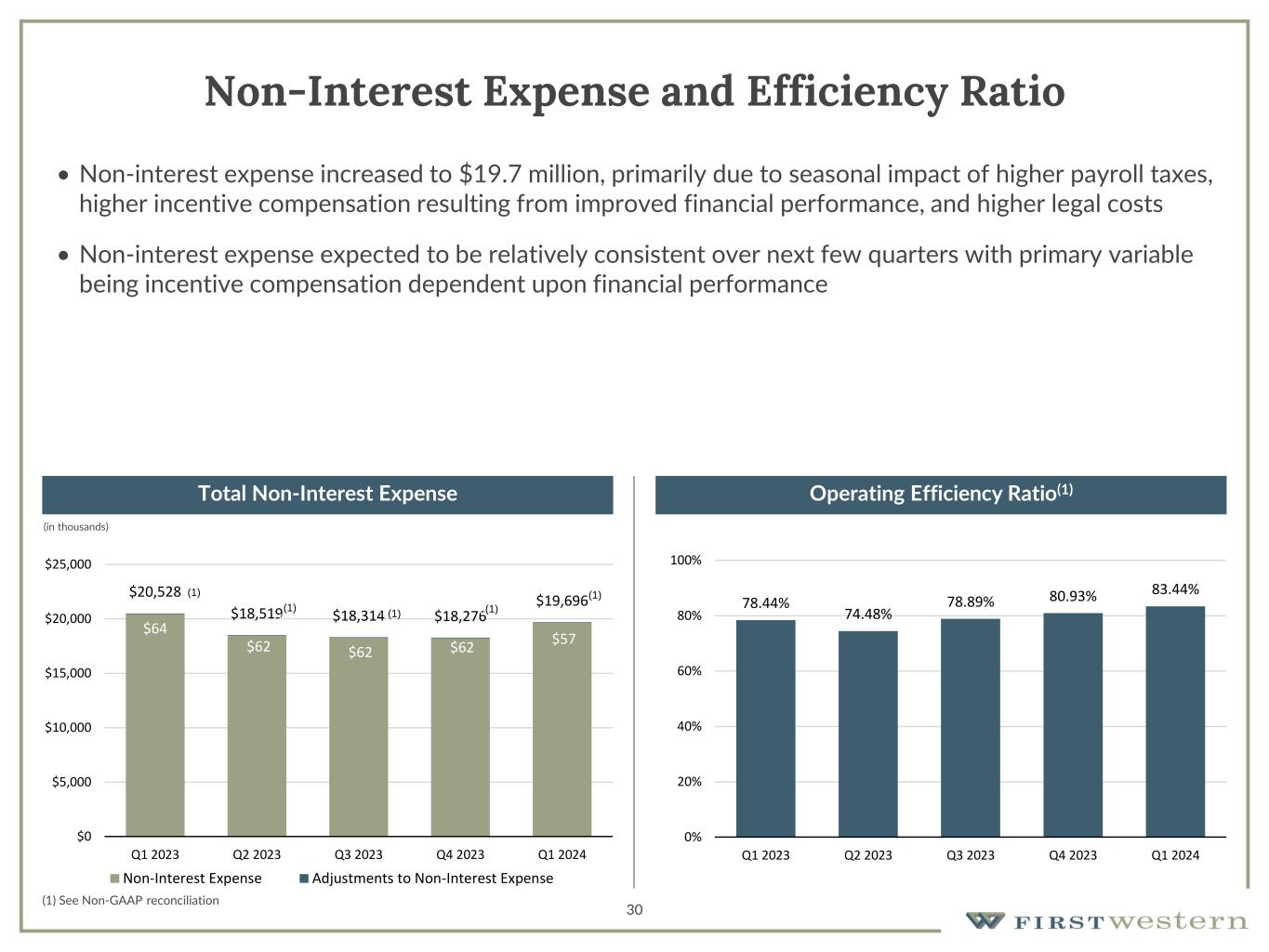 29 Non-Interest Income • Non-interest income increased 19.7% from prior quarter • Increase driven by higher Trust and Investment Management fees, Net Gain on Mortgage Loans, and Bank Fees, partially offset by lower Risk Management and Insurance Fees, which are seasonally higher in the fourth quarter each year • Mortgage production increased to $91 million from $67 million in prior quarter, primarily due to increased home buying activity in our markets and production from mortgage loan originators hired in 2024 • Increase in Net Gain on Mortgage Loans also resulted from higher average gain on sale margins (in thousands) Total Non-Interest Income Trust and Investment Management Fees (in thousands) $5,806 $3,962 $6,099 $6,081 $7,277 -$4,000 -$2,000 $0 $2,000 $4,000 $6,000 $8,000 $10,000 Q1 2023 Q2 2023 Q3 2023 Q4 2023 Q1 2024 Trust and Investment Management Fees Net Gain on Mortgage Loans Bank Fees Risk Management and Insurance Fees Income on Company-Owned Life Insurance Other $4,635 $4,602 $4,846 $4,705 $4,930 $4,000 $4,200 $4,400 $4,600 $4,800 $5,000 Q1 2023 Q2 2023 Q3 2023 Q4 2023 Q1 2024