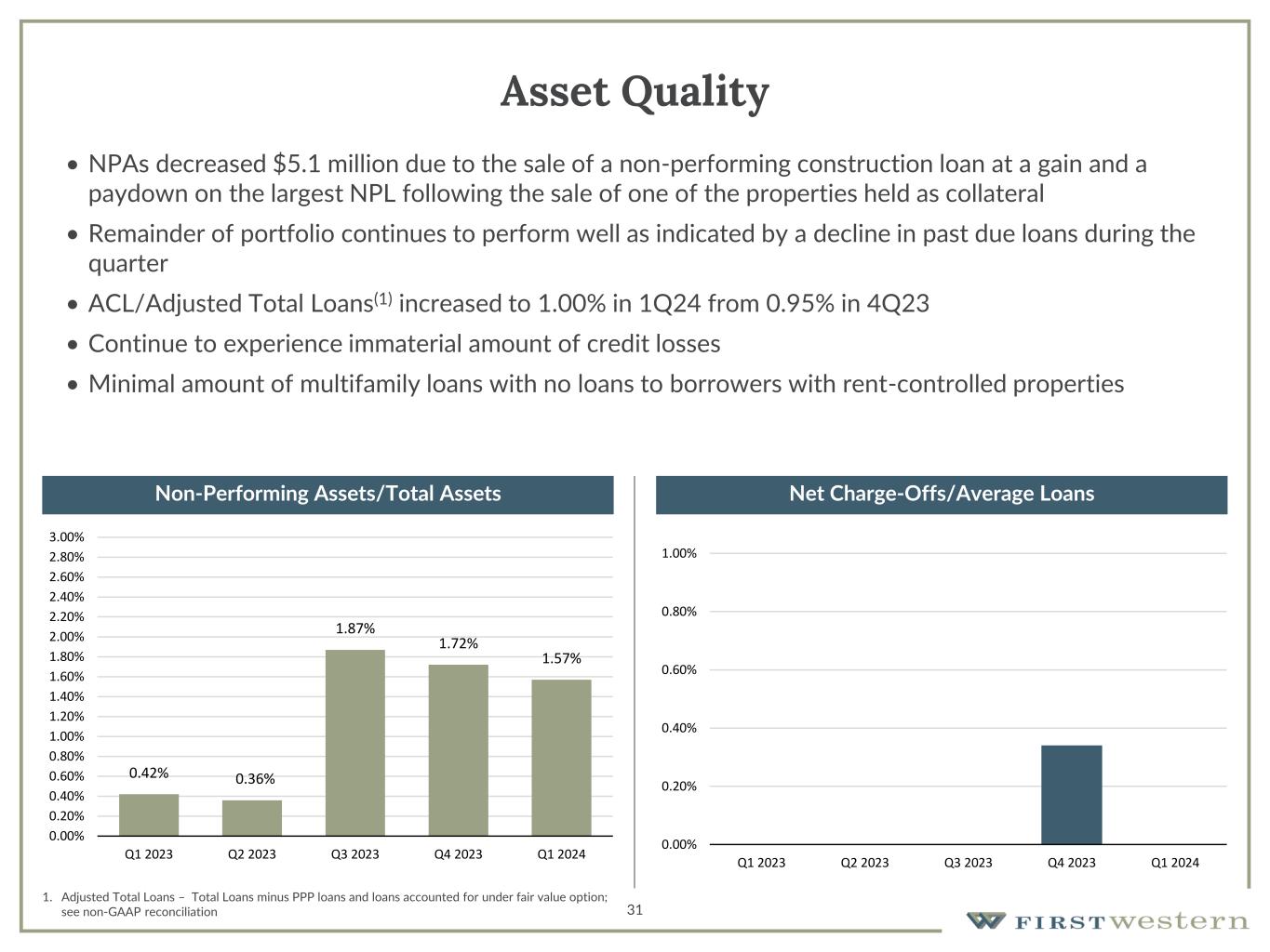 $64 $62 $62 $62 $57 $20,528 $18,519 $18,314 $18,276 $19,696 $0 $5,000 $10,000 $15,000 $20,000 $25,000 Q1 2023 Q2 2023 Q3 2023 Q4 2023 Q1 2024 Non-Interest Expense Adjustments to Non-Interest Expense 30 Non-Interest Expense and Efficiency Ratio • Non-interest expense increased to $19.7 million, primarily due to seasonal impact of higher payroll taxes, higher incentive compensation resulting from improved financial performance, and higher legal costs • Non-interest expense expected to be relatively consistent over next few quarters with primary variable being incentive compensation dependent upon financial performance (1) (1) See Non-GAAP reconciliation Total Non-Interest Expense Operating Efficiency Ratio(1) (in thousands) (1) (1) (1) (1) (1) (1)(1) (1) (1) 78.44% 74.48% 78.89% 80.93% 83.44% 0% 20% 40% 60% 80% 100% Q1 2023 Q2 2023 Q3 2023 Q4 2023 Q1 2024