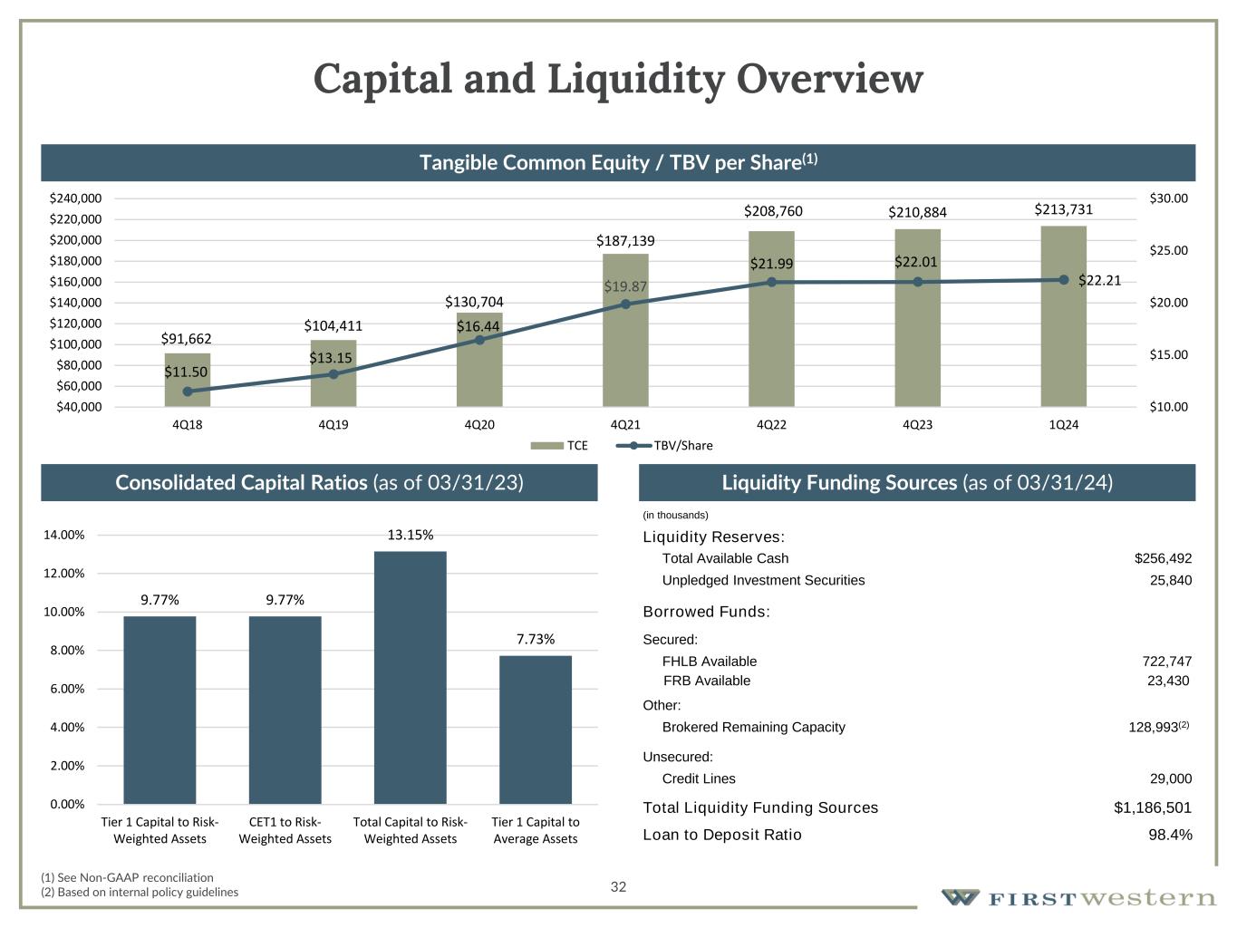 31 Asset Quality • NPAs decreased $5.1 million due to the sale of a non-performing construction loan at a gain and a paydown on the largest NPL following the sale of one of the properties held as collateral • Remainder of portfolio continues to perform well as indicated by a decline in past due loans during the quarter • ACL/Adjusted Total Loans(1) increased to 1.00% in 1Q24 from 0.95% in 4Q23 • Continue to experience immaterial amount of credit losses • Minimal amount of multifamily loans with no loans to borrowers with rent-controlled properties Non-Performing Assets/Total Assets Net Charge-Offs/Average Loans 1. Adjusted Total Loans – Total Loans minus PPP loans and loans accounted for under fair value option; see non-GAAP reconciliation 0.42% 0.36% 1.87% 1.72% 1.57% 0.00% 0.20% 0.40% 0.60% 0.80% 1.00% 1.20% 1.40% 1.60% 1.80% 2.00% 2.20% 2.40% 2.60% 2.80% 3.00% Q1 2023 Q2 2023 Q3 2023 Q4 2023 Q1 2024 0.00% 0.20% 0.40% 0.60% 0.80% 1.00% Q1 2023 Q2 2023 Q3 2023 Q4 2023 Q1 2024