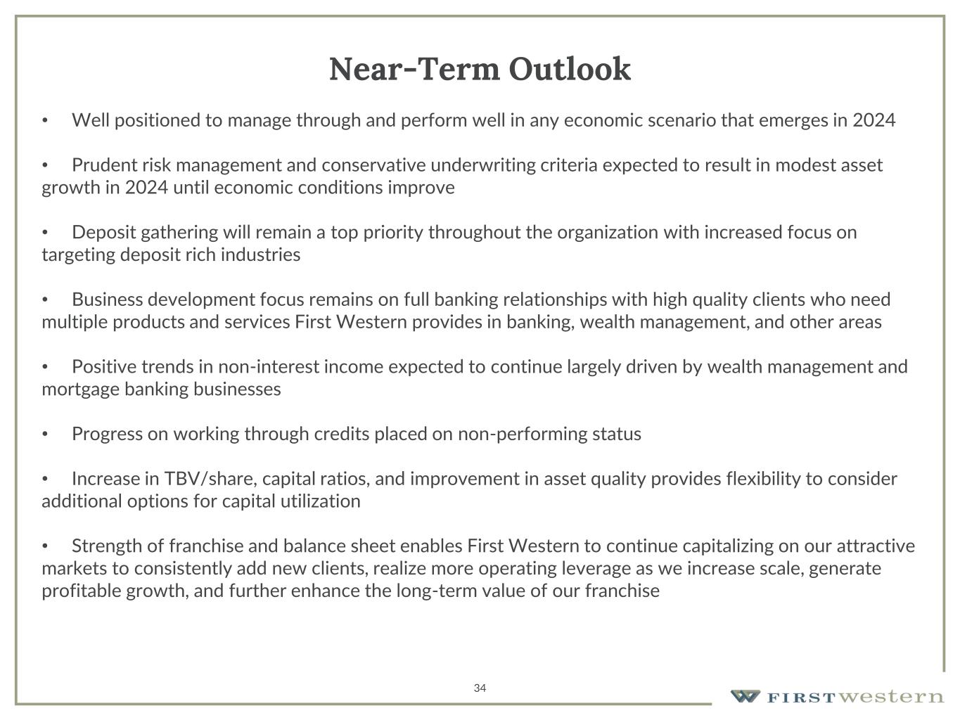 34 Near-Term Outlook • Well positioned to manage through and perform well in any economic scenario that emerges in 2024 • Prudent risk management and conservative underwriting criteria expected to result in modest asset growth in 2024 until economic conditions improve • Deposit gathering will remain a top priority throughout the organization with increased focus on targeting deposit rich industries • Business development focus remains on full banking relationships with high quality clients who need multiple products and services First Western provides in banking, wealth management, and other areas • Positive trends in non-interest income expected to continue largely driven by wealth management and mortgage banking businesses • Progress on working through credits placed on non-performing status • Increase in TBV/share, capital ratios, and improvement in asset quality provides flexibility to consider additional options for capital utilization • Strength of franchise and balance sheet enables First Western to continue capitalizing on our attractive markets to consistently add new clients, realize more operating leverage as we increase scale, generate profitable growth, and further enhance the long-term value of our franchise