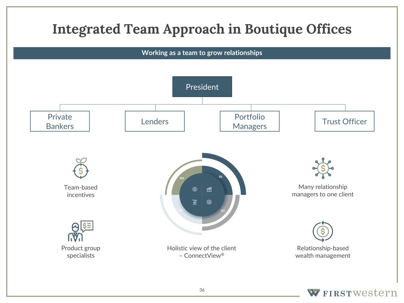 Working as a team to grow relationships 36 Integrated Team Approach in Boutique Offices President Private Bankers Lenders Portfolio Managers Trust Officer Team-based incentives Relationship-based wealth management Many relationship managers to one client Product group specialists Holistic view of the client – ConnectView®