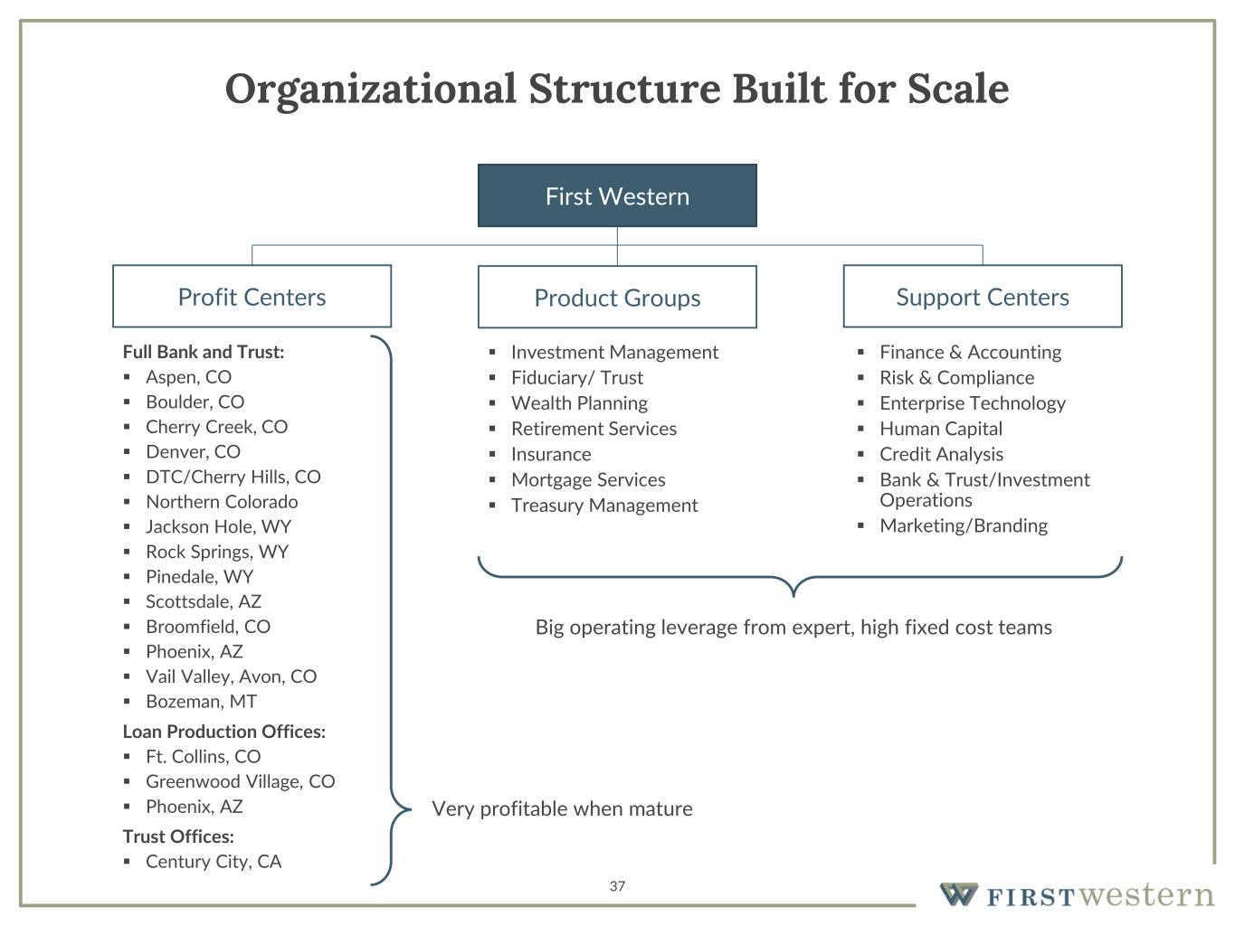 37 Organizational Structure Built for Scale Full Bank and Trust: ▪ Aspen, CO ▪ Boulder, CO ▪ Cherry Creek, CO ▪ Denver, CO ▪ DTC/Cherry Hills, CO ▪ Northern Colorado ▪ Jackson Hole, WY ▪ Rock Springs, WY ▪ Pinedale, WY ▪ Scottsdale, AZ ▪ Broomfield, CO ▪ Phoenix, AZ ▪ Vail Valley, Avon, CO ▪ Bozeman, MT Loan Production Offices: ▪ Ft. Collins, CO ▪ Greenwood Village, CO ▪ Phoenix, AZ Trust Offices: ▪ Century City, CA ▪ Investment Management ▪ Fiduciary/ Trust ▪ Wealth Planning ▪ Retirement Services ▪ Insurance ▪ Mortgage Services ▪ Treasury Management First Western Profit Centers Product Groups Support Centers ▪ Finance & Accounting ▪ Risk & Compliance ▪ Enterprise Technology ▪ Human Capital ▪ Credit Analysis ▪ Bank & Trust/Investment Operations ▪ Marketing/Branding Big operating leverage from expert, high fixed cost teams Very profitable when mature